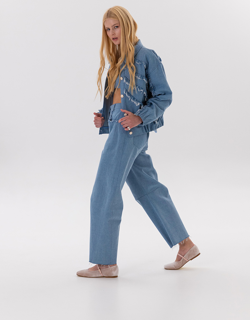 Доставка впродовж 2-5 робочих днівДжинси складного крою. З виточкою на колінах. Оздоблення бахромою.