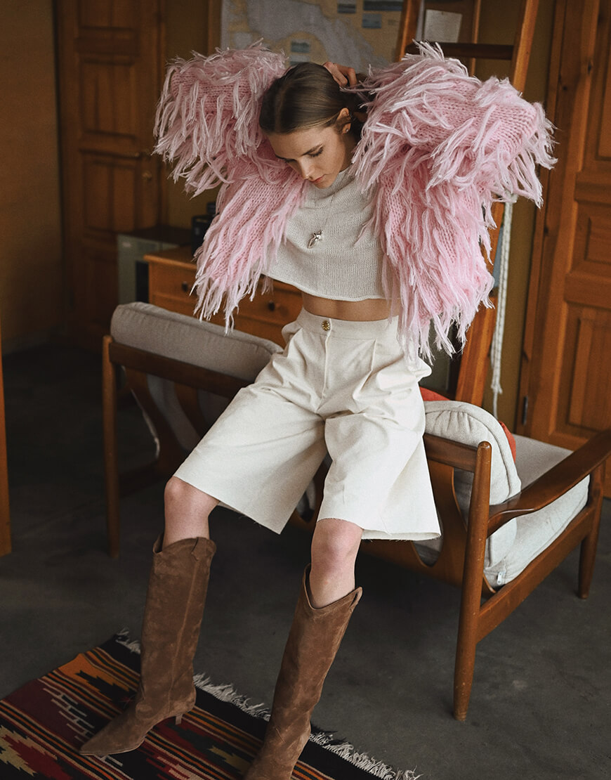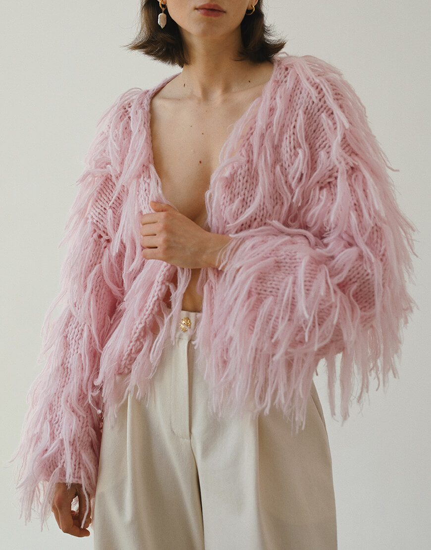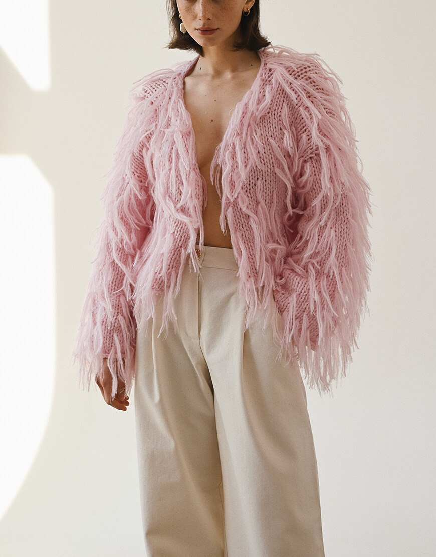 Шуба з вовни альпаки та мериносу виконана у рожевому кольорі. Матеріал дуже приємний до тіла та комфортний у носінні та догляді. Виріб дуже теплий та зручний, виконаний повністю вручну.Кардиган представлений у одному розмірі, створює грайливий та привабливий силует.Рекомендуємо поєднувати кардиган зі штанами, спідницями, лонгслівами, футболками та аксесуарами ручної роботи.