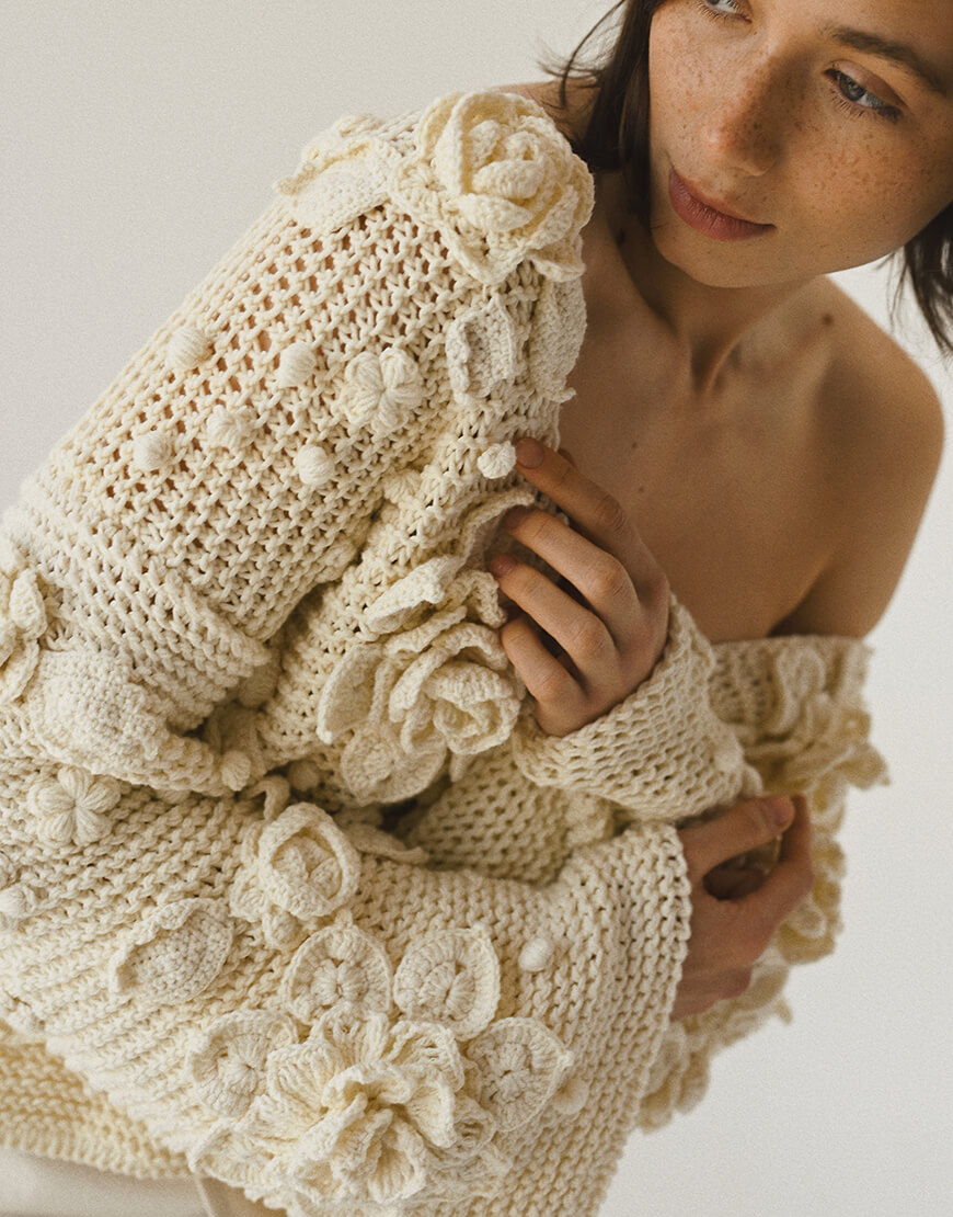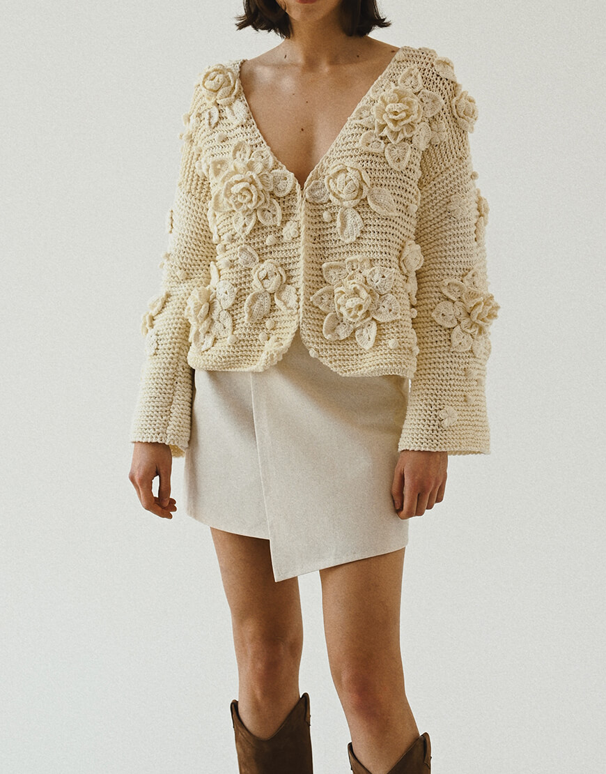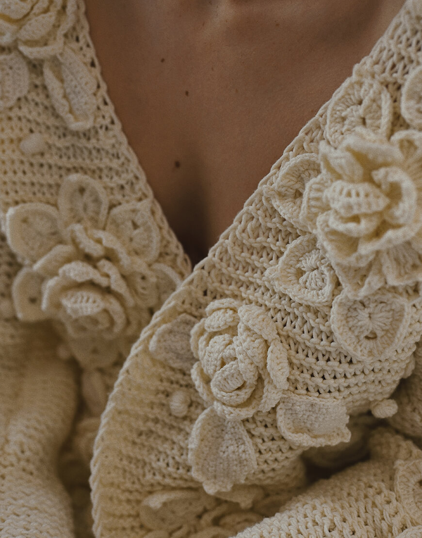 Кардиган зі 100% бавовни виконаний у молочному кольорі. Матеріал дуже приємний до тіла та комфортний у носінні та догляді. Виріб дуже теплий та зручний, виконаний повністю вручну. Кардиган представлений у двох розмірах, створює розслаблений та привабливий силует.Рекомендуємо поєднувати кардиган з сукнями та аксесуарами ручної роботи.