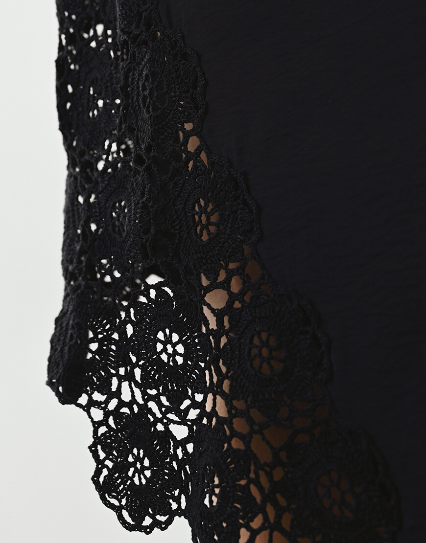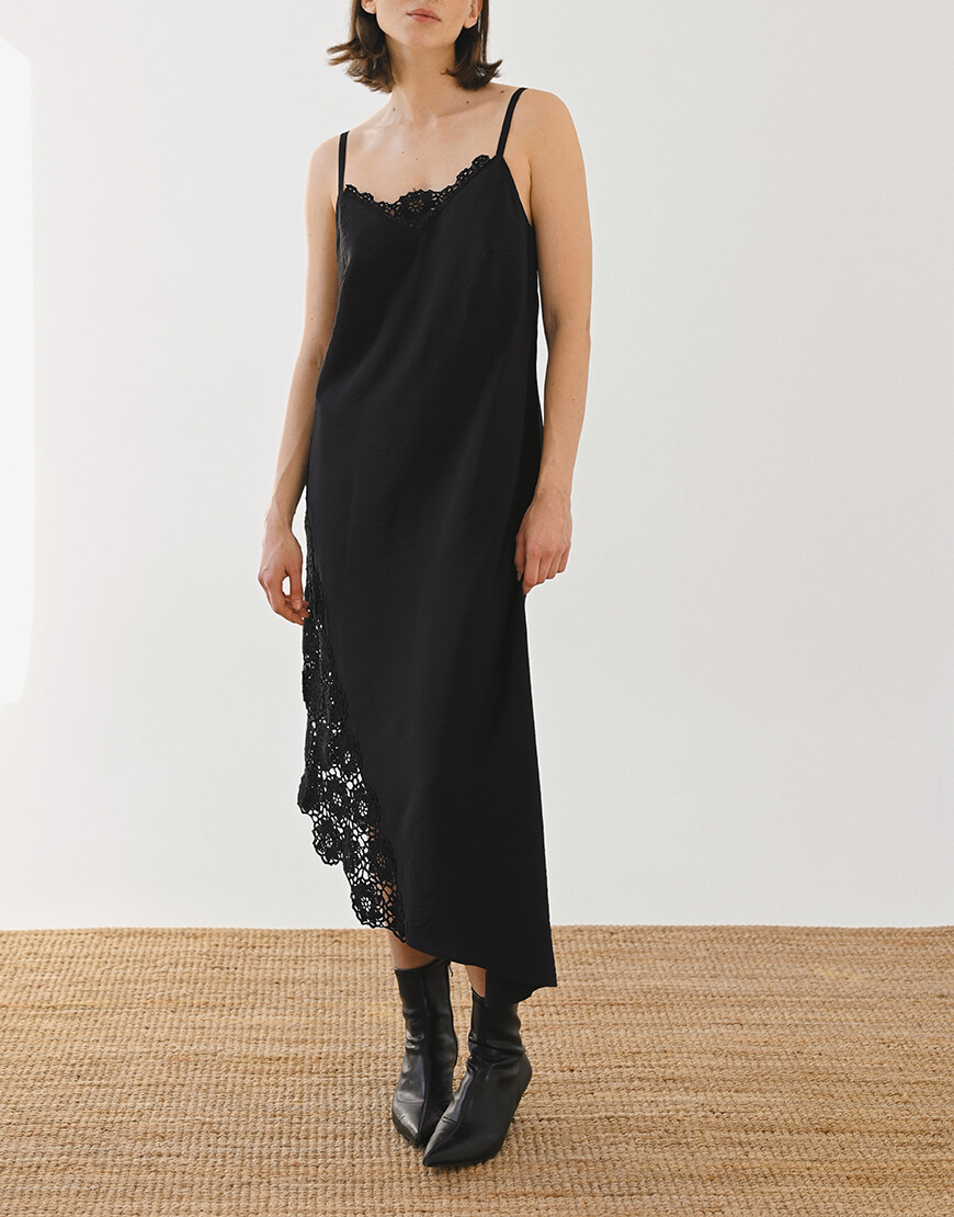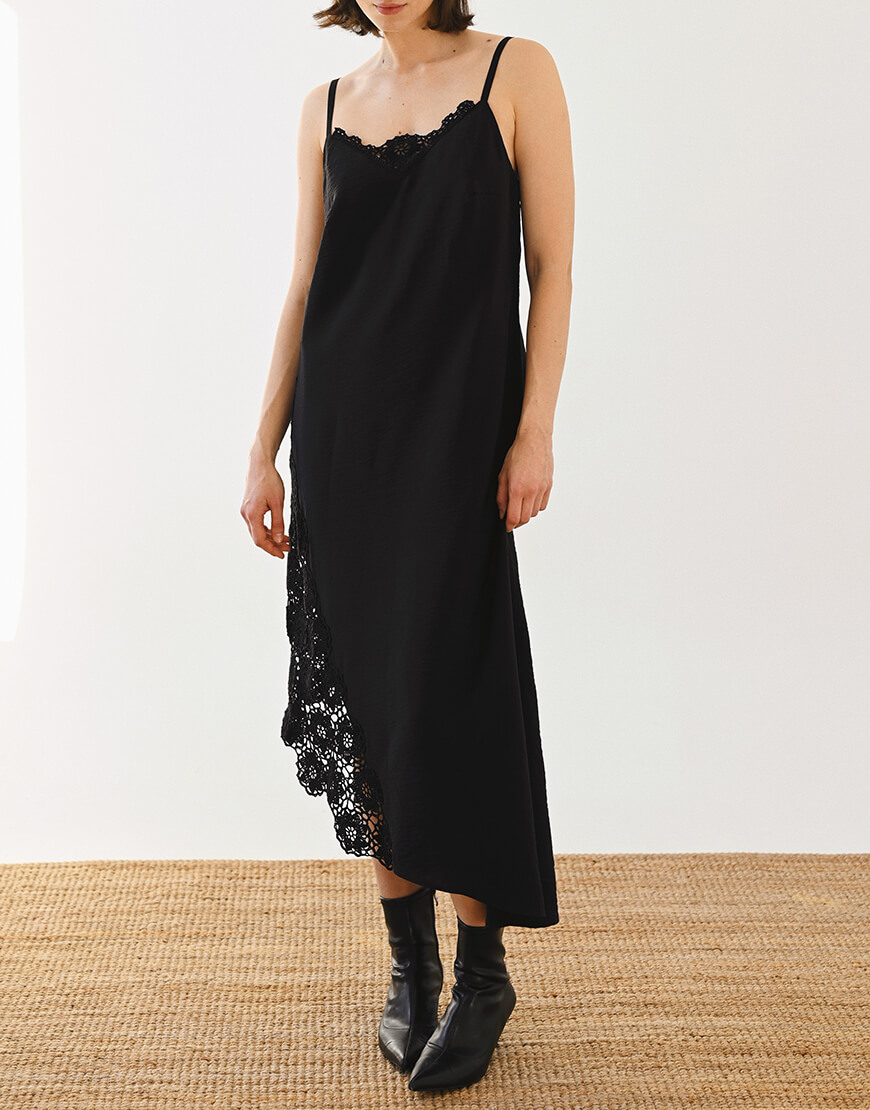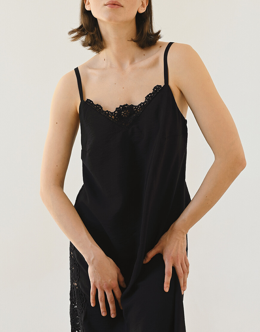 Доставка впродовж 5-14 робочих днівСукня з віскози у довжині максі виконана у чорному кольорі. Тканина дуже м‘яка, приємна до тіла та легка. В’язані елементи вздовж сукні виконані вручну. Сукня тримається на тонких бретелях. Посадка сукні регулюється за допомогою зав’язок.Дана модель представлена у трьох розмірах, створює жіночний та розслаблений силует.Рекомендуємо поєднувати сукню зі прикрасами з хризоліту та мінералів, хусткою та комірцем Feelings.