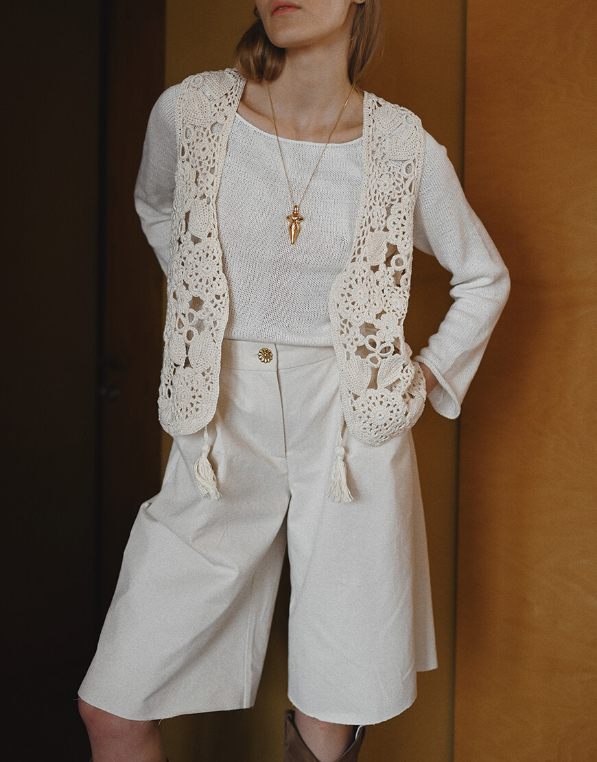 Шорти зі 100% бавовни виконана у молочному кольорі. Матеріал дуже приємний до тіла, комфортний у носінні.Дана модель представлена у трьох розмірах, створює витончений та жіночний силует.Рекомендуємо поєднувати шорти з лонгслівами, футболками, сорочками та светрами.