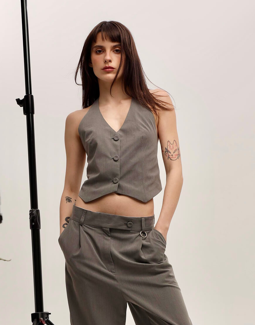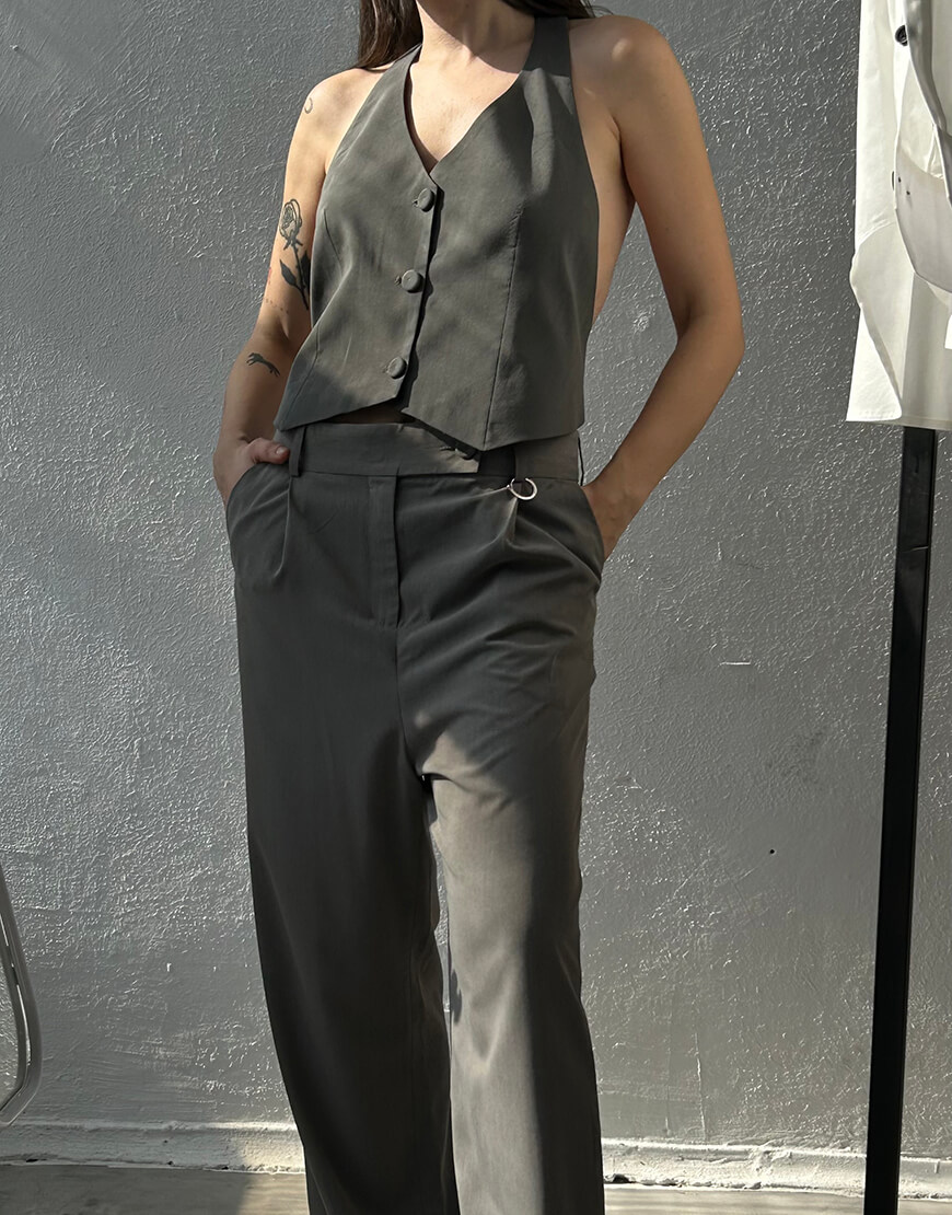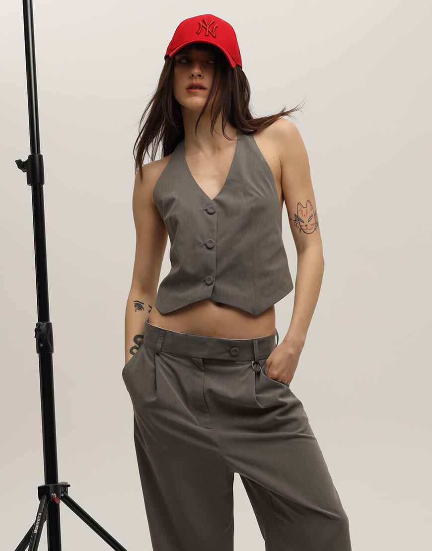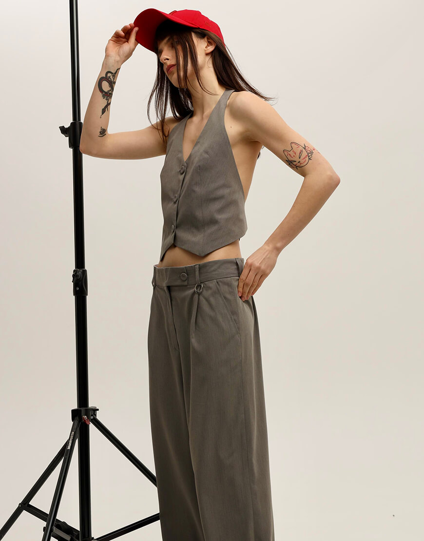 Жилетка сірого кольру з красивою відкритою спинкою регулюєтся гудзиками на пдкладці