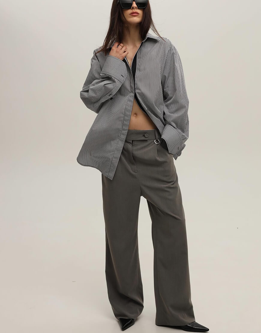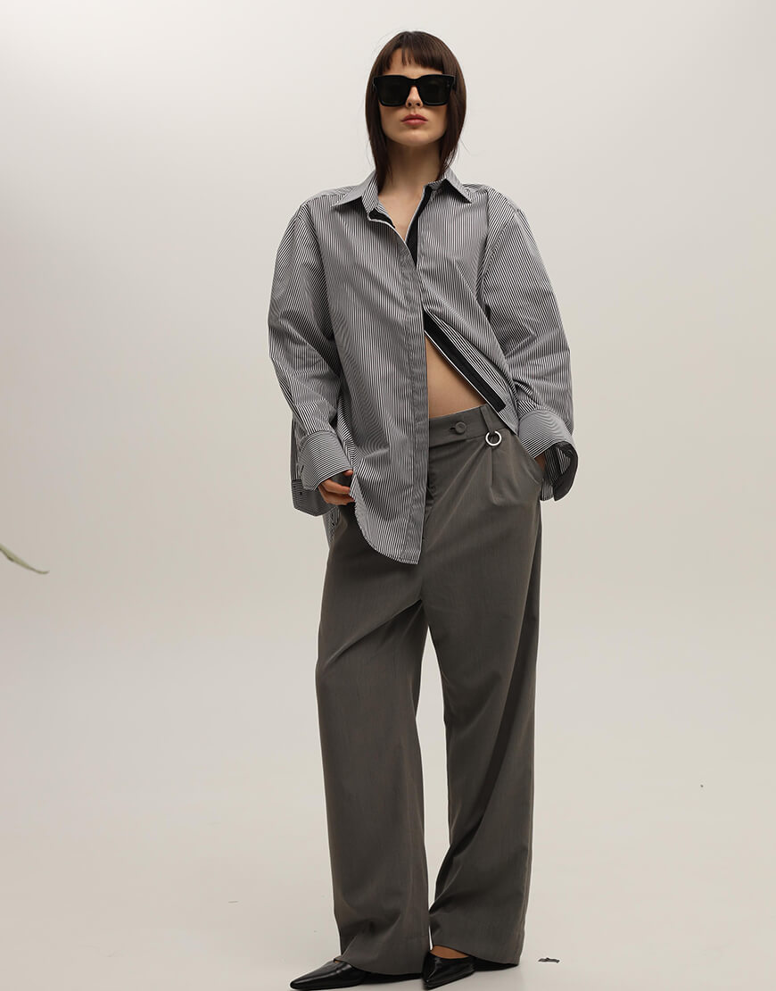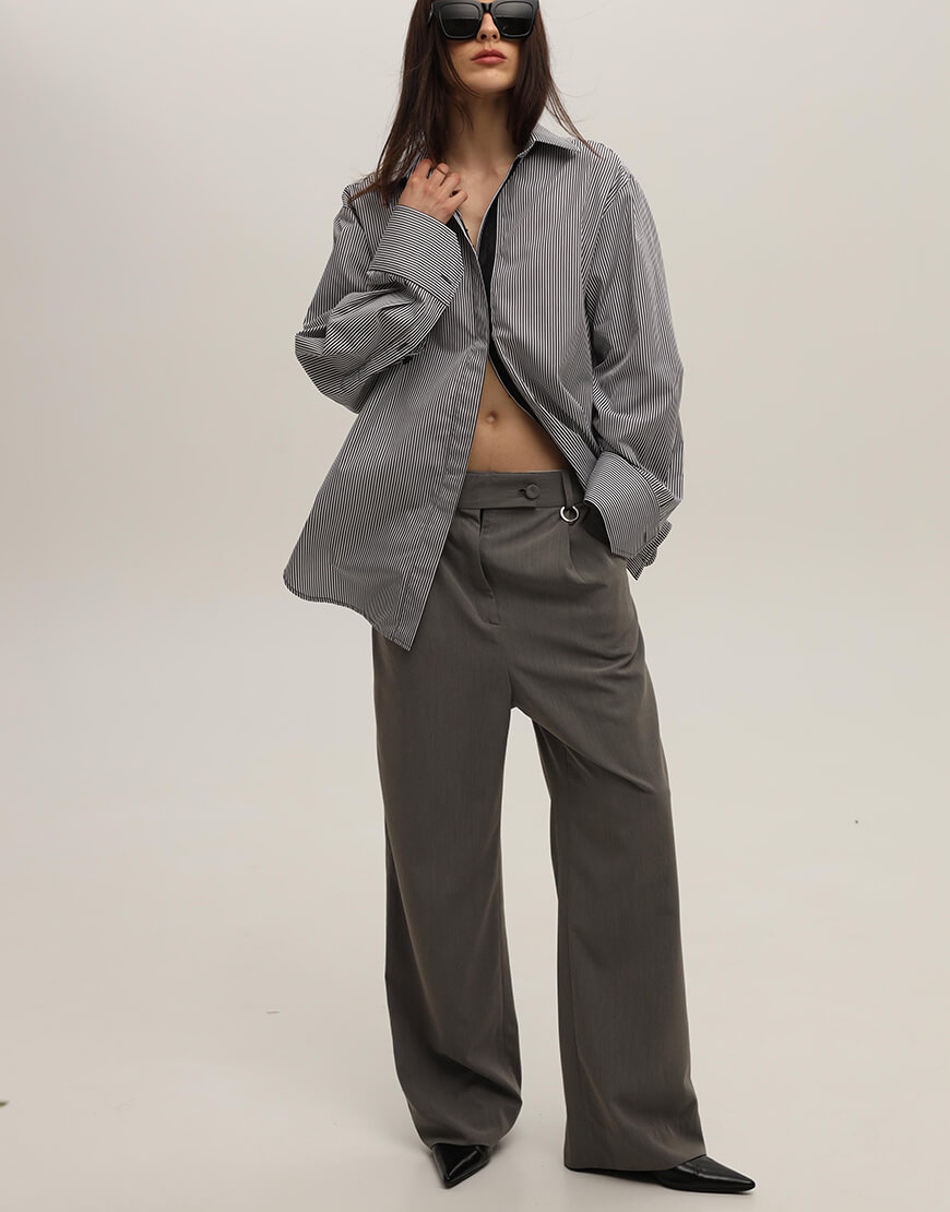 Брюки з заниженую посадкою сірого кольру з боковими кишенями та металевим декором без підкладки