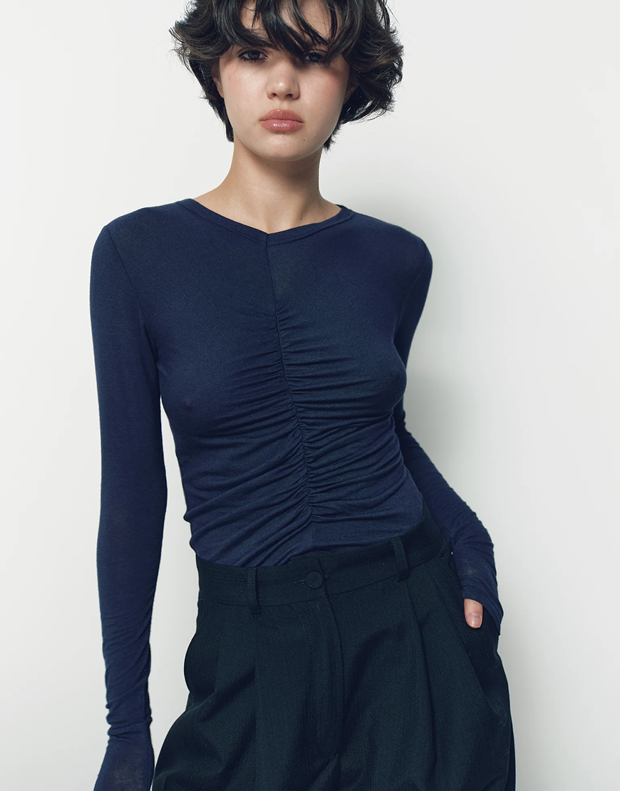 лонгслів у синьому кольору з драпіруванням по переду тканина тонка , еластична та має дуже приємні тактильні відчуття.
