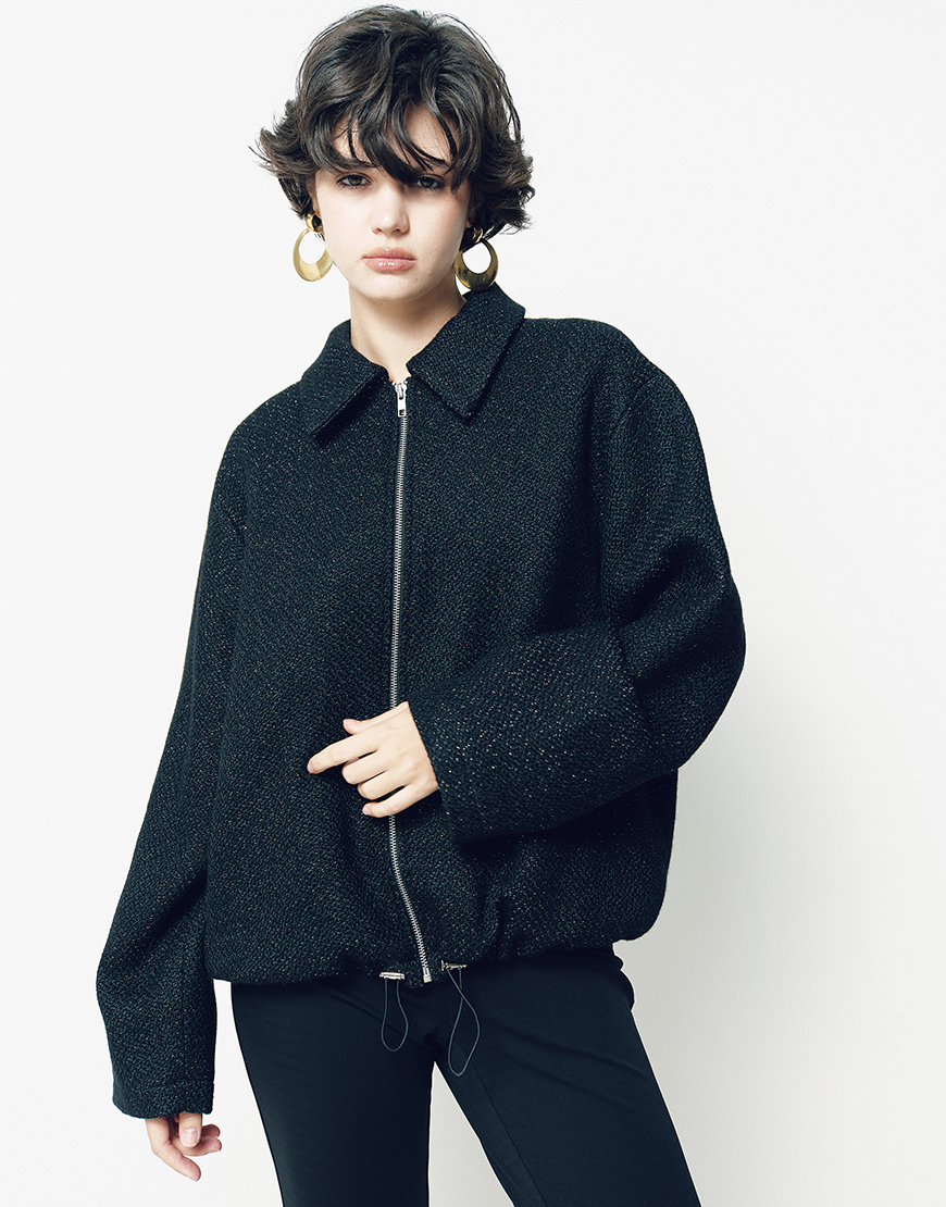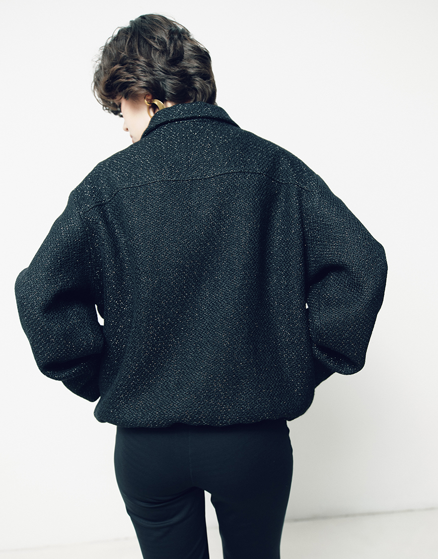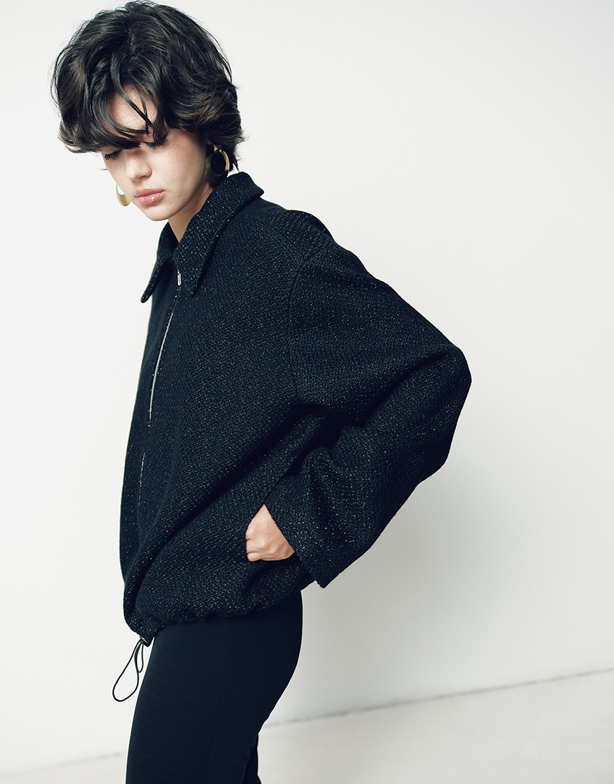 Оверсайз Бомбер чорного кольору з фактурної тканини , з боковими кишенями на підкладці з утепленням застібуєтся на блискавку.