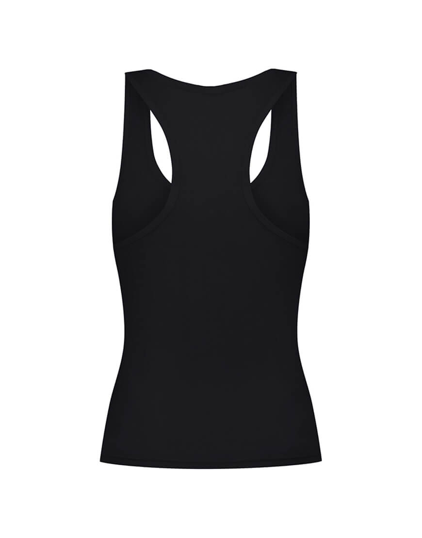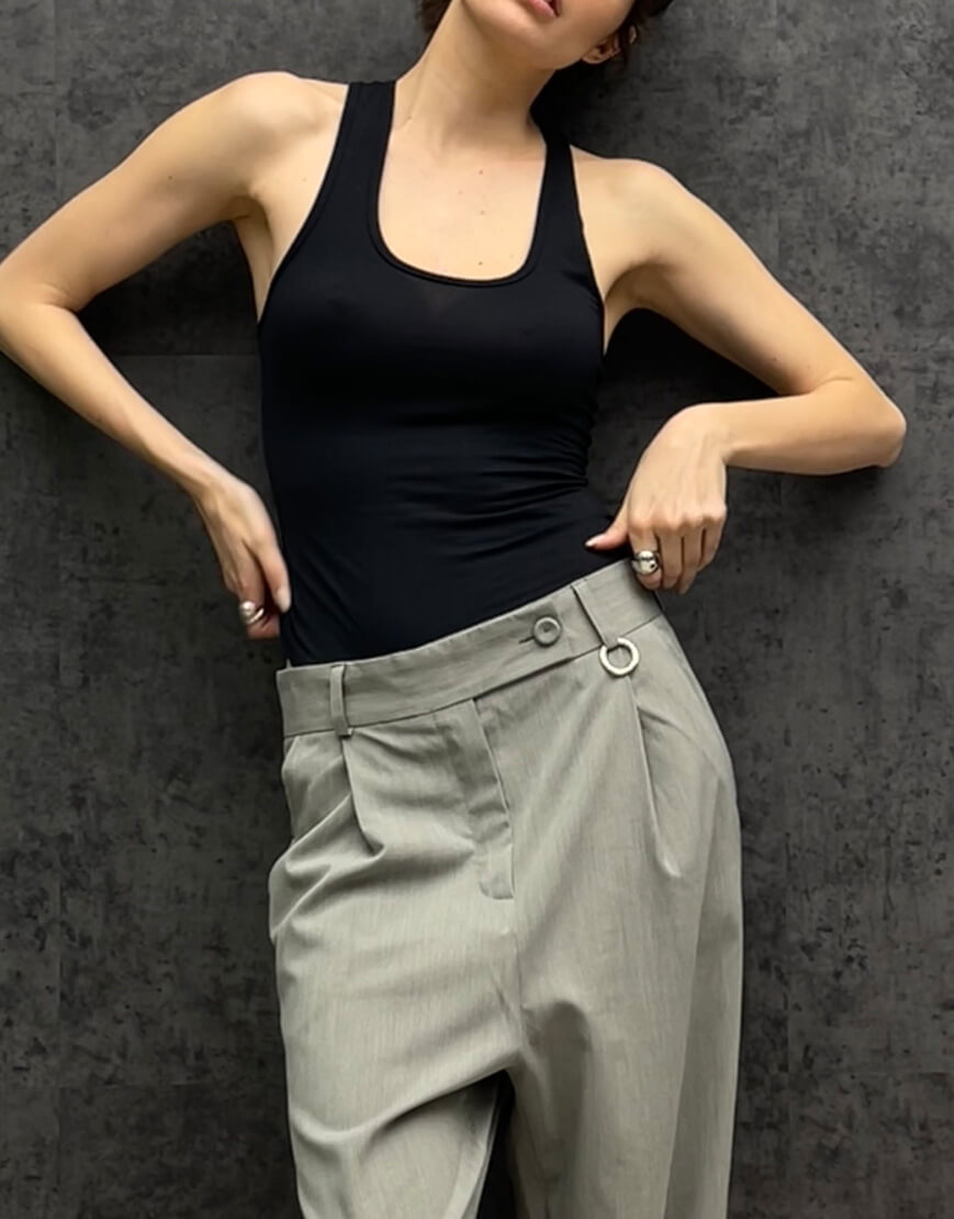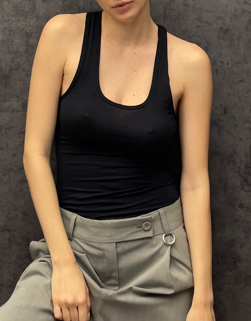 Базова майка білого кольору з приємної тканини злегка прозорої з глибоким вирізом та хрестовидним вирізом на спинці