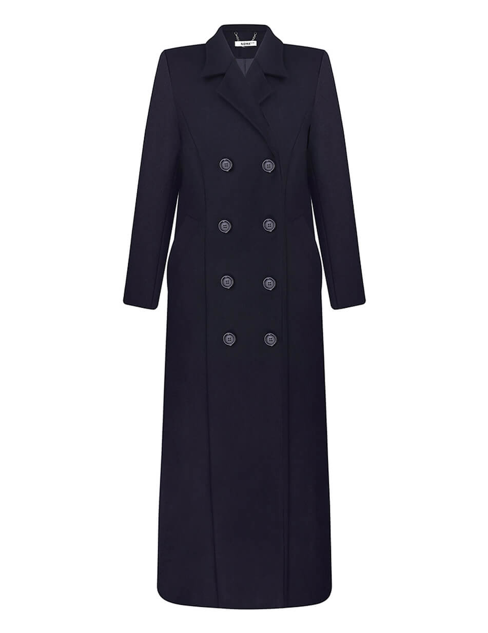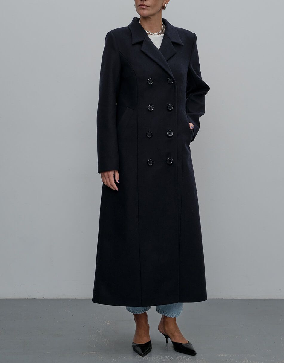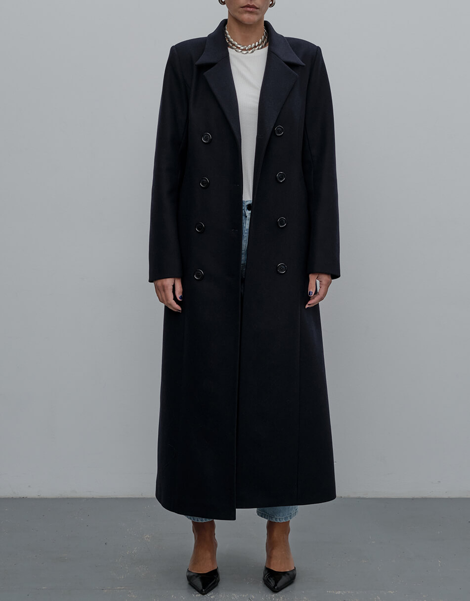 Пальто двобортне кольору неві. Силует приталений, з боковими кишенями. Підкладка – темного кольору.