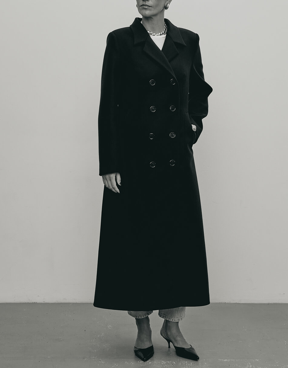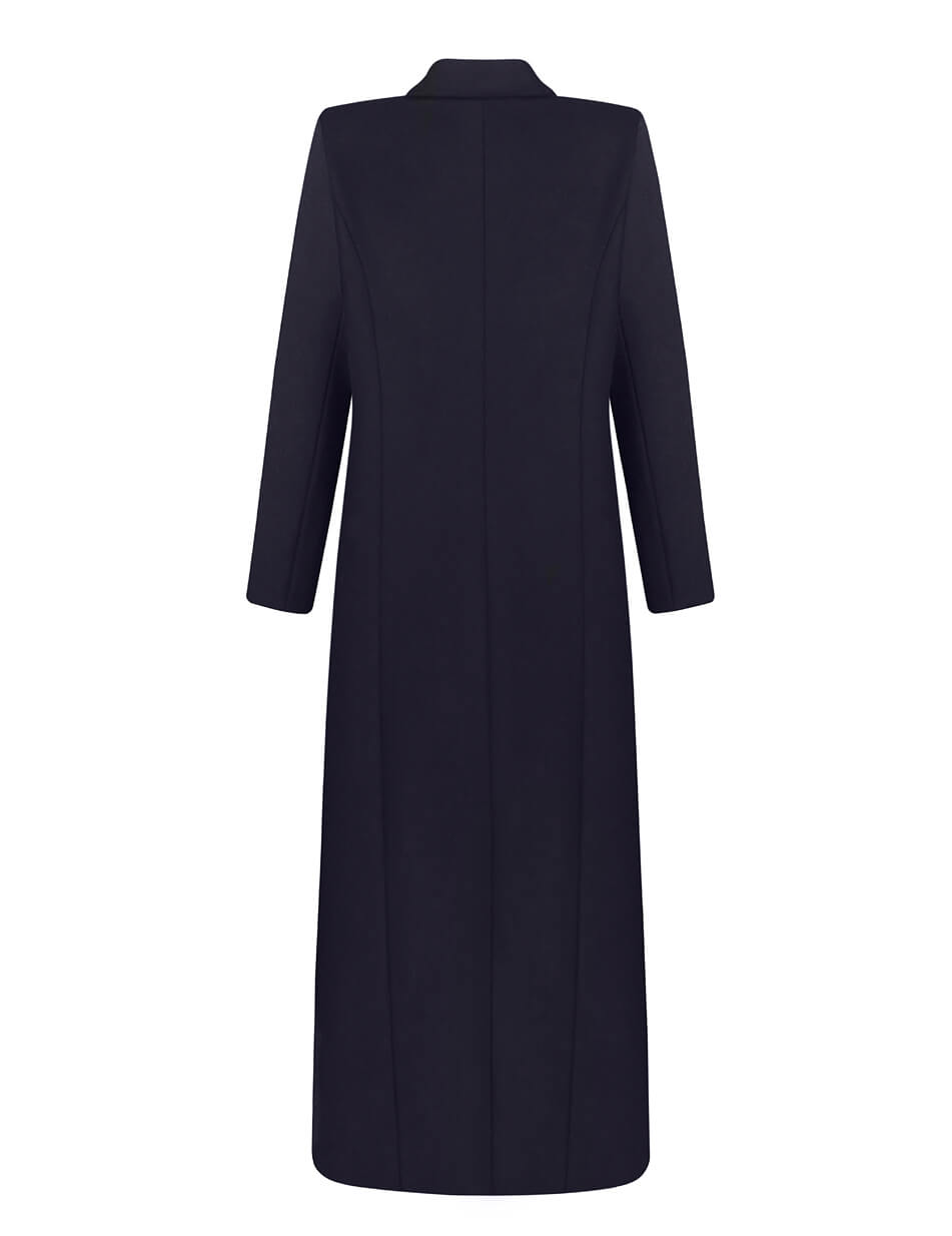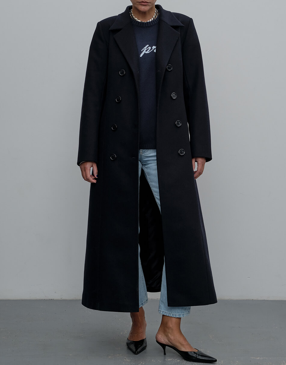 Пальто двобортне кольору неві. Силует приталений, з боковими кишенями. Підкладка – темного кольору.