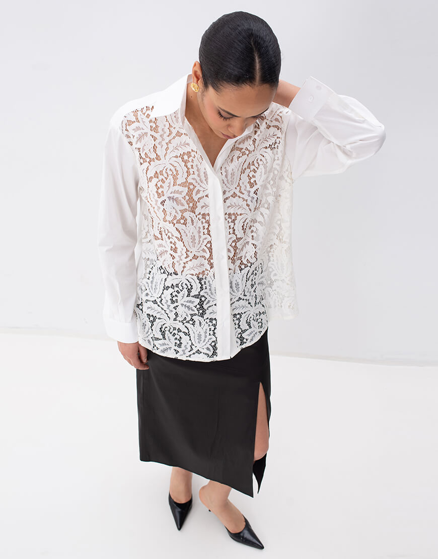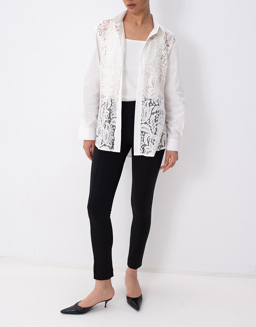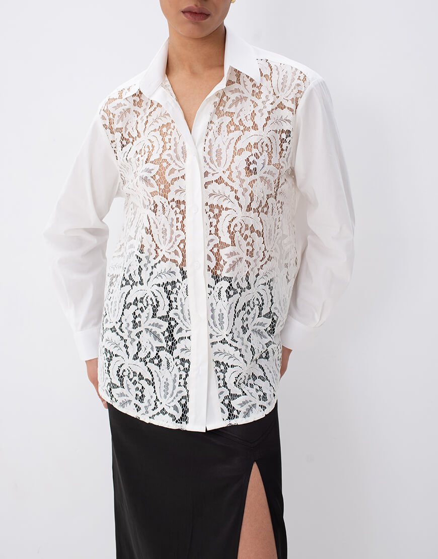 Молочна класична сорочка з мереживною вставкою, гудзики з пластику