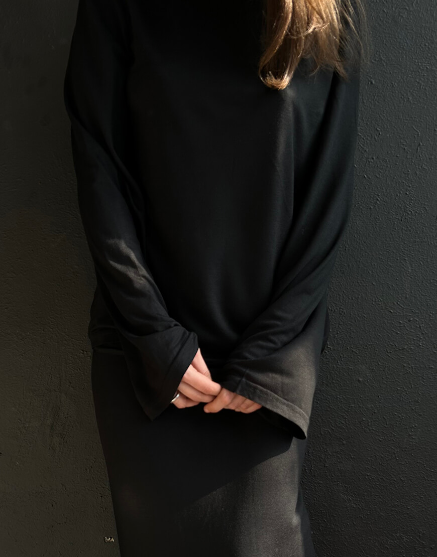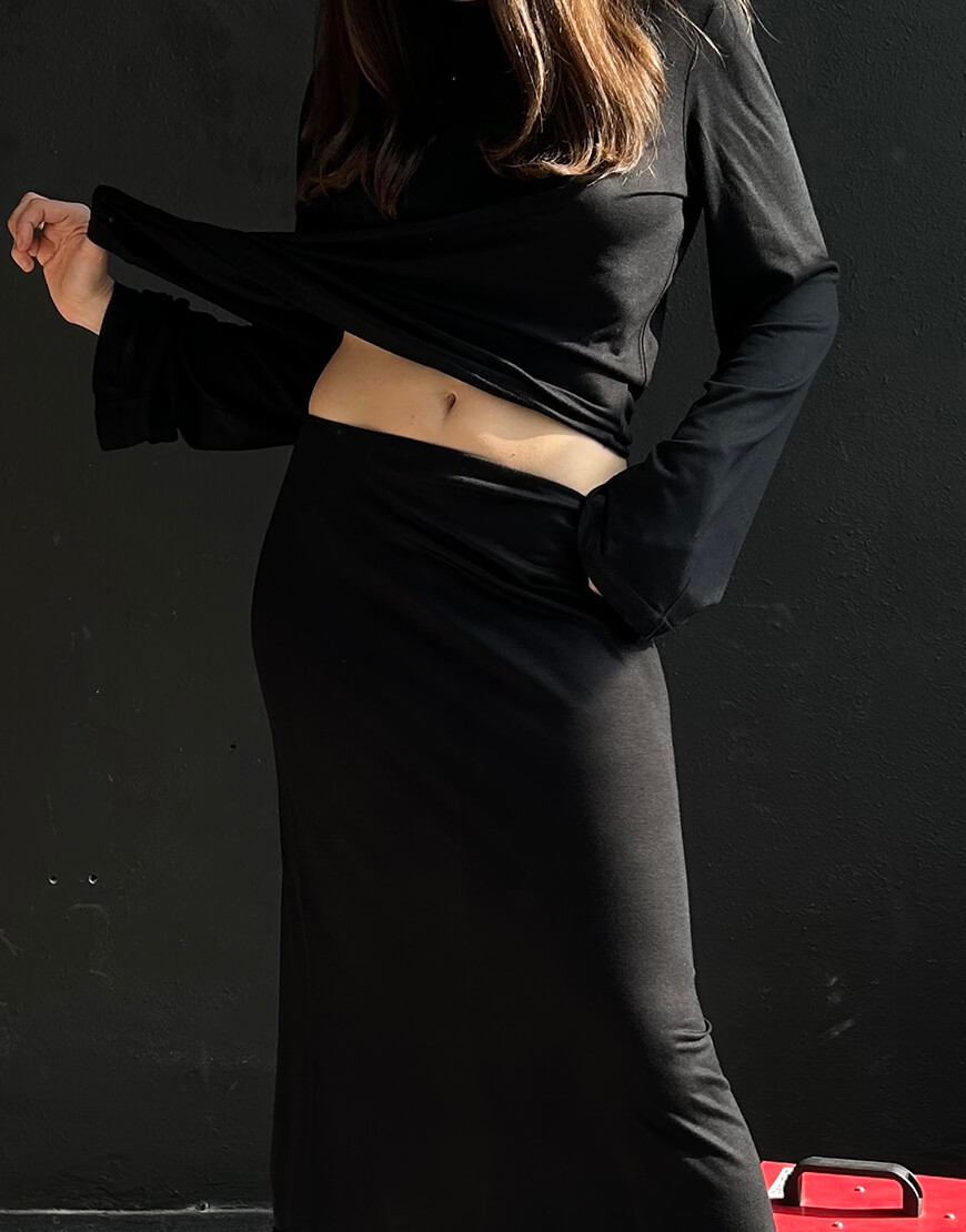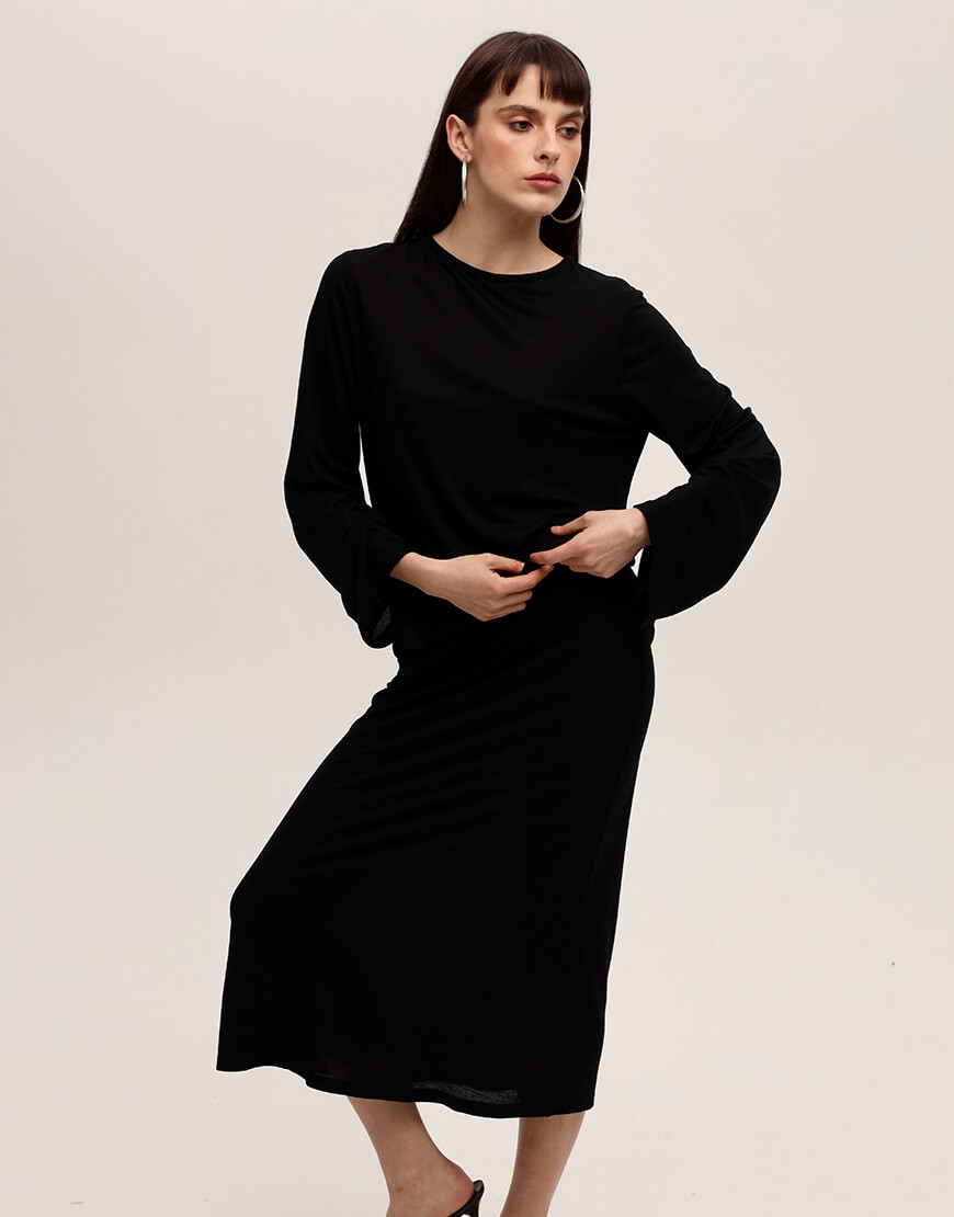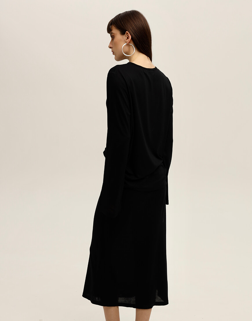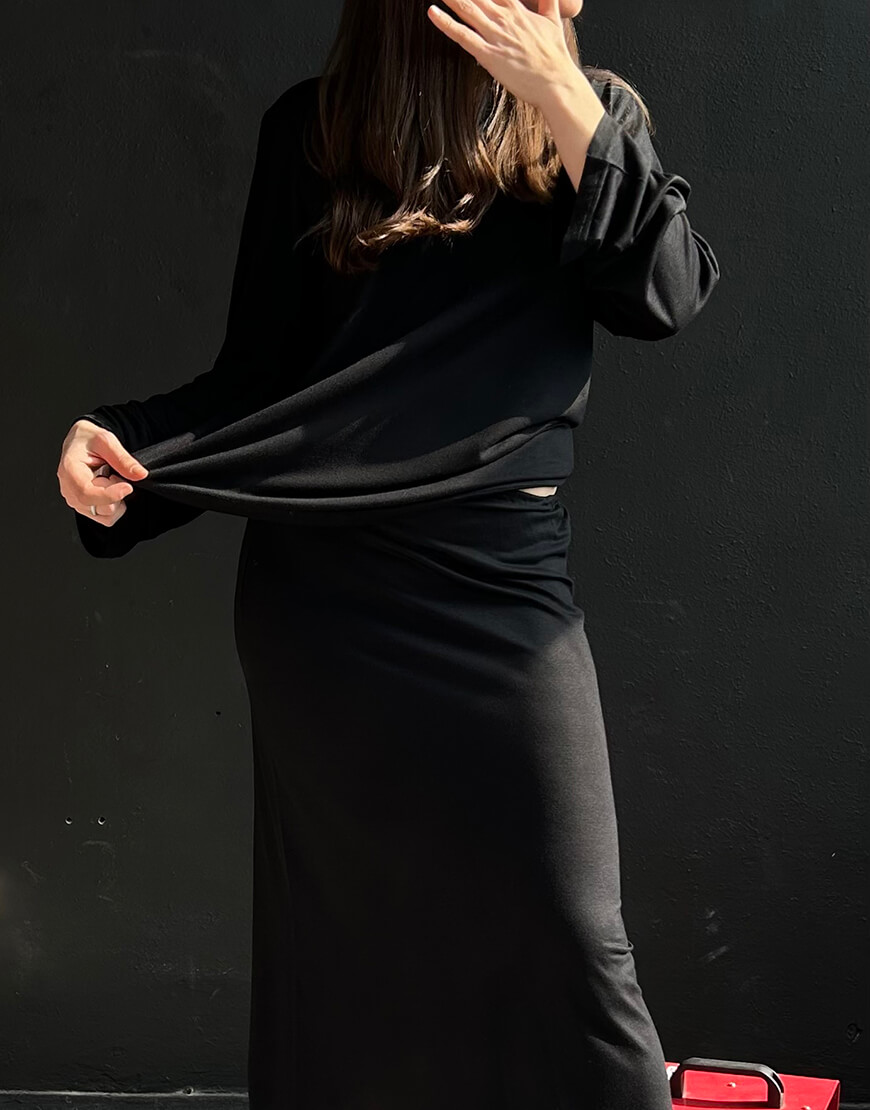 Доставка впродовж 2-14 робочих днівЧорний трикотажний комплект, що складаєтся з лонгсліву та спідниці спідниця на резинці міді довжини лонгслів оверсайз з подовженним рукавом
