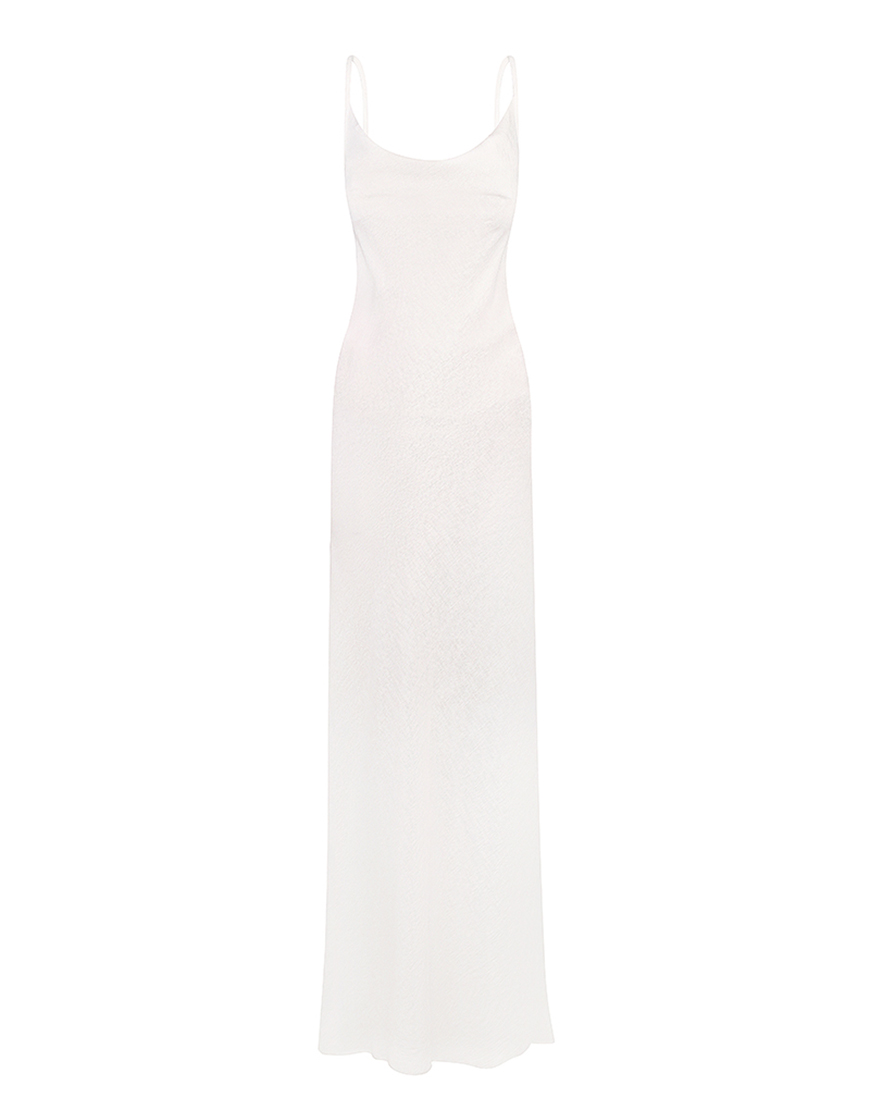 Сукня-комбінація з драпіруванням на грудях , максі довжини фіксується зав’язками за металеві кільця з логотипом колір білий