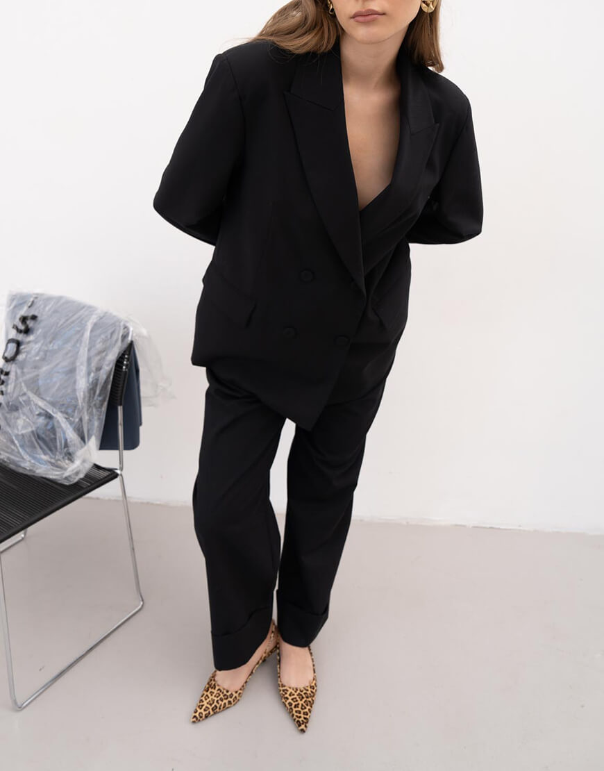 Чорні широкі брюки моделі палаццо з підкладкою та з карманами знизу штанина з манжетом