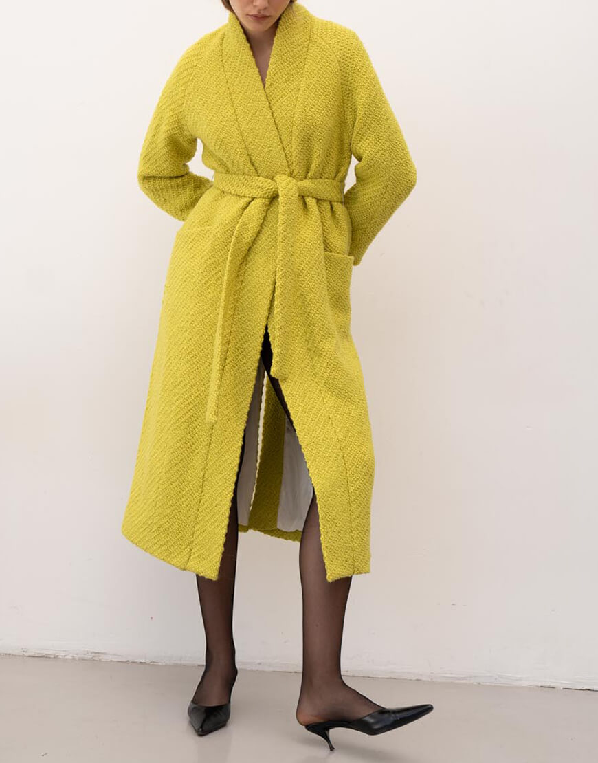 Кардиган на підкладці з фактурноі тканини яскравого лимоного кольору ,модель приталеного силуету, присутній пояс та кармани