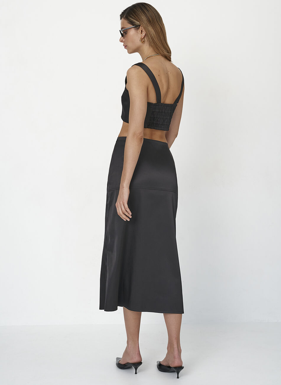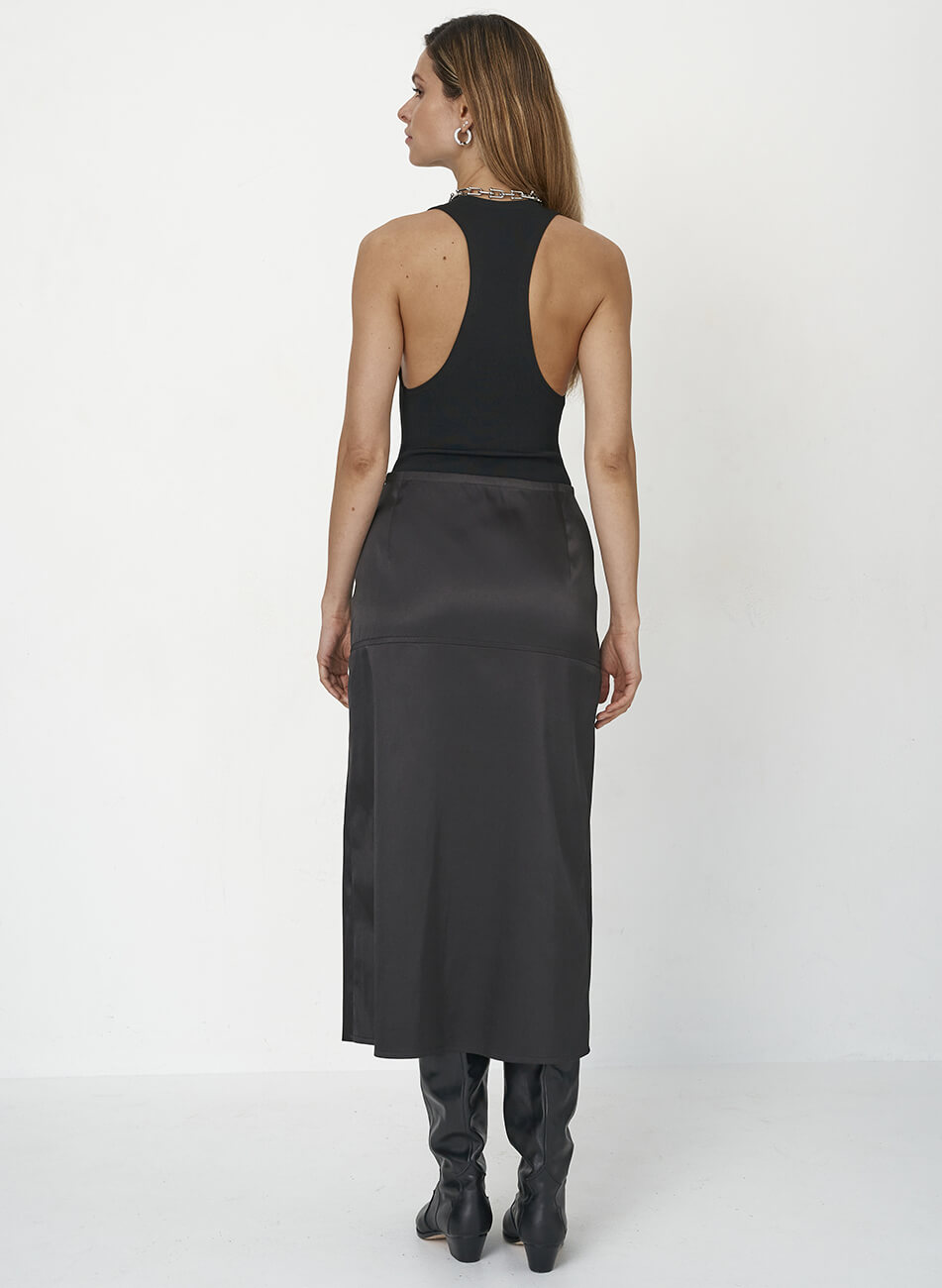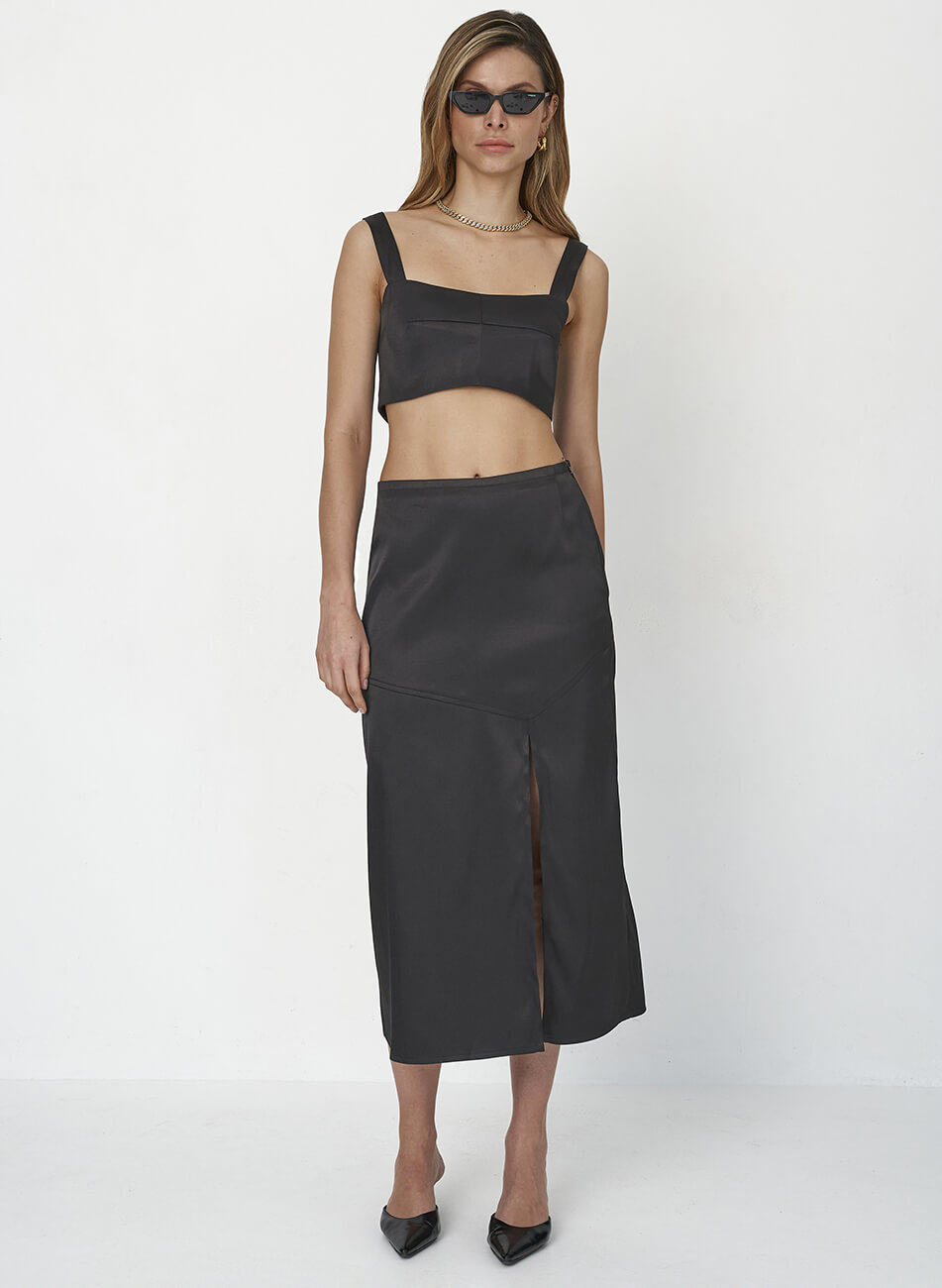 Спідниця міді чорного кольору з фактурними відстрочками та розрізом з лівого боку. Тканина атласна.