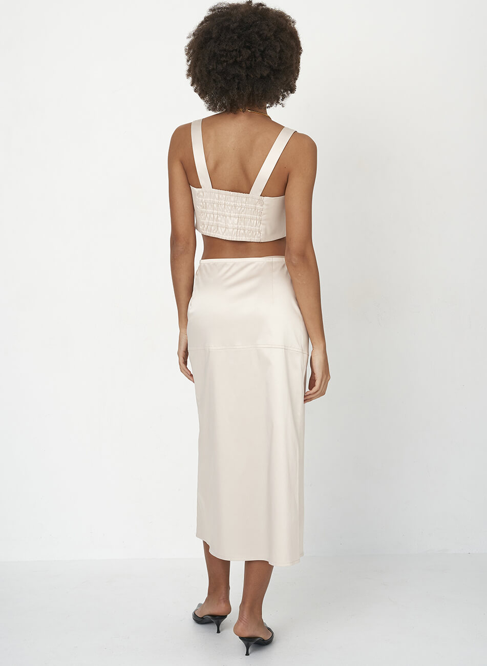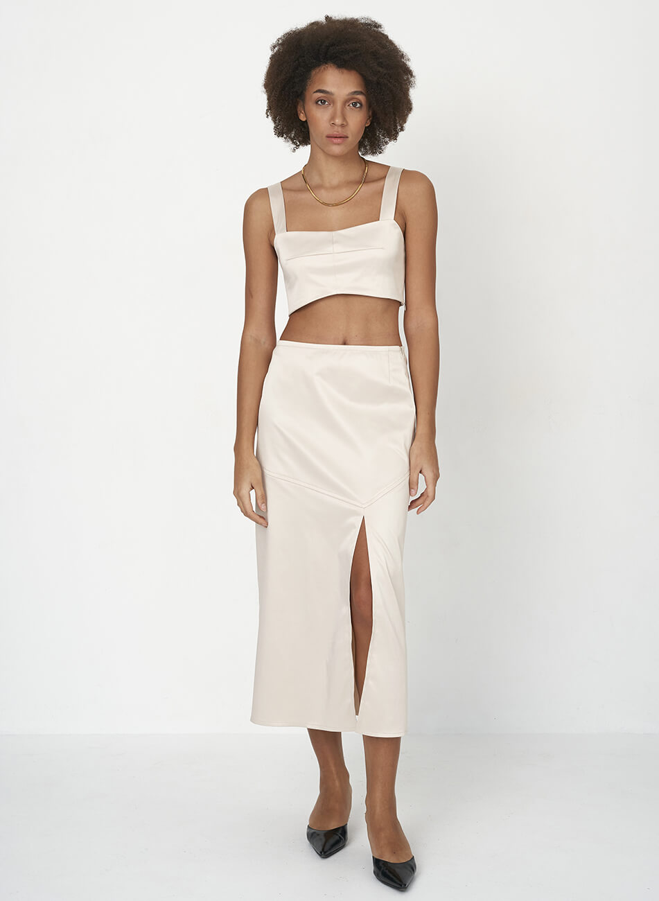 Спідниця мідді бежевого кольору з фактурними відстрочками та розрізом з лівого боку. Тканина атласна.