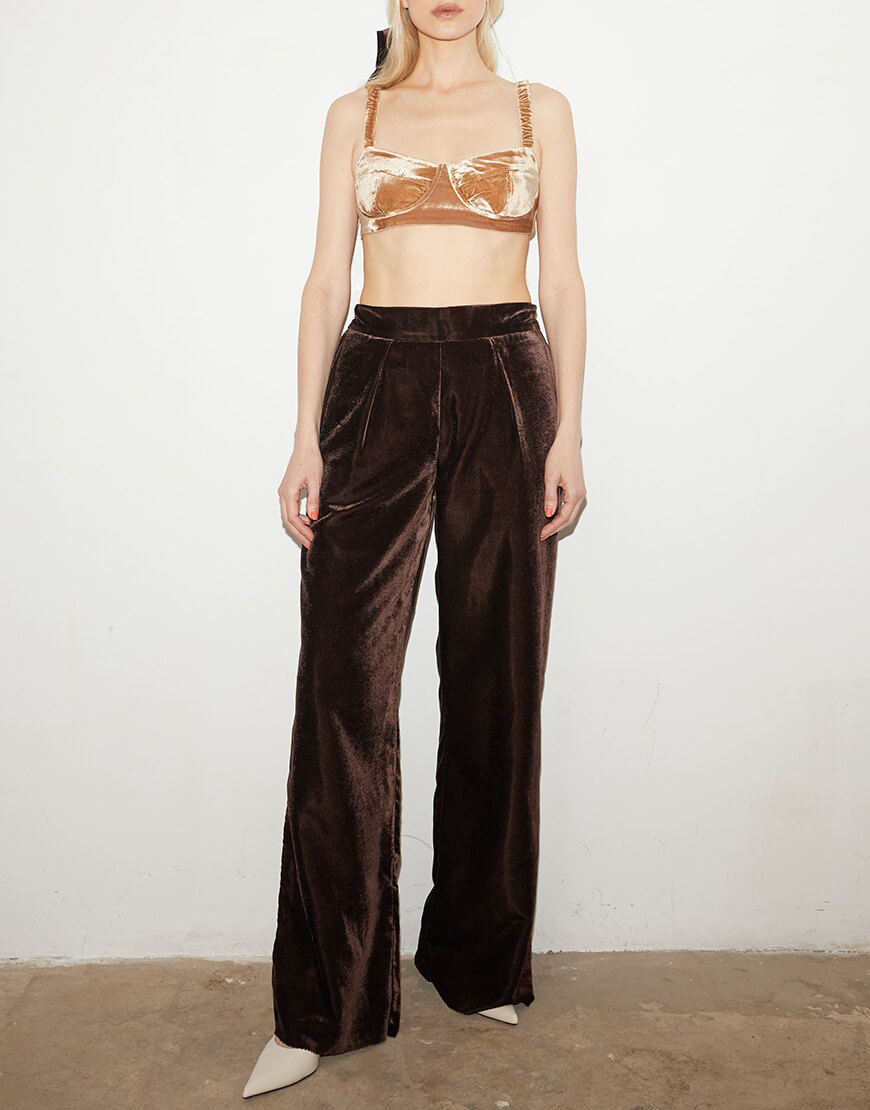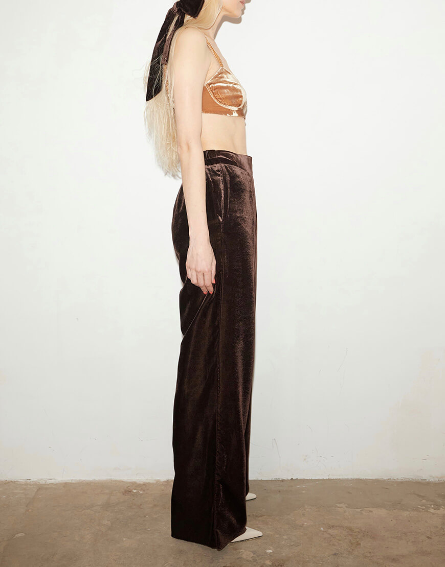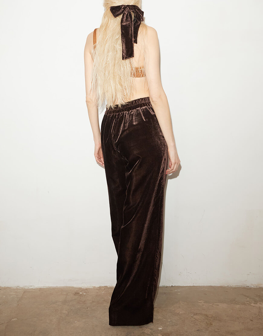 Брюки палаццо з шовково-бавовняного оксамиту. Безкомпромісний комфорт, вишукана тканина і універсальний крій, що дає змогу стилізації як в кежуал лук, так і в вечірній образ.Вивірене лекало подовжує силует і пасує дівчатам з різними типами фігури та зростом.В комплект входить термострічка для самостійного швидкого регулювання довжини брюк. (Максимальний зріст 180 см).