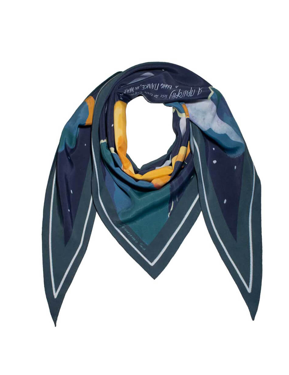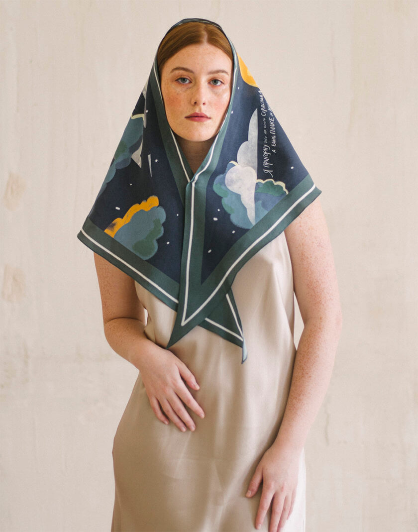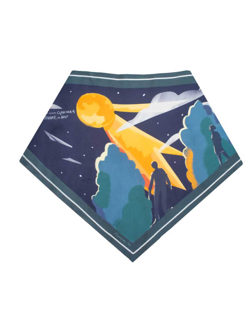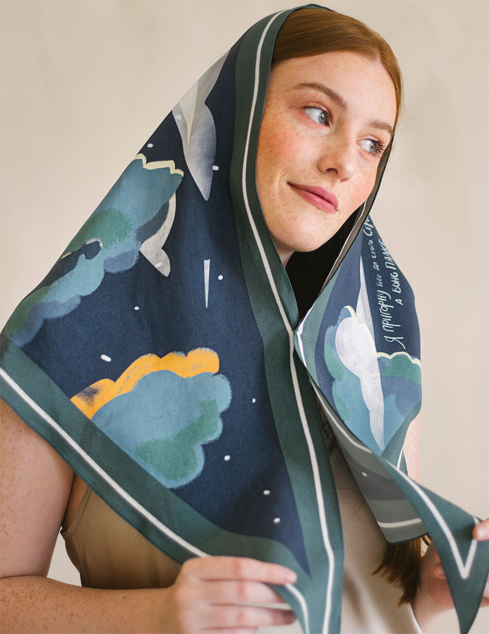 Малюнок платка нагадує музичну пластинку, адже кожен платок розповідає історію. Особливі аутентичні українські пісні, знайомі кожному з дитинства, пробуджують найщиріші почуття, нагадують про прості, але важливі цінності, які лягли в основу сюжетів платків. Кожен платок дбайливо створений з TENCEL, що виготовляється з стружки евкаліптового дерева, має антисептичні властивості, тому не викликає подразнень і не електризує волосся. Нам імпонує, що TENCEL — екологічний матеріал: для його виробництва використовується значно менше води, ніж для виготовлення бавовни, а також цей матеріал підлягає переробці. Ілюстрації, нанесені на TENCEL за допомогою цифрового друку на сучасному обладнанні, збережуть свої насичені кольори надовго.