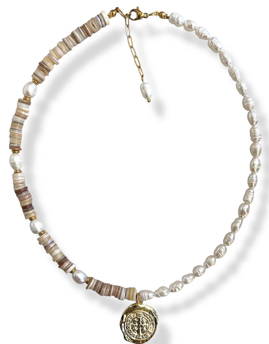 Доставка впродовж 2-5 робочих днівНамисто з медальйоном, мушлями та натуральними перлинами, довжина 36+4 см,вага 39г