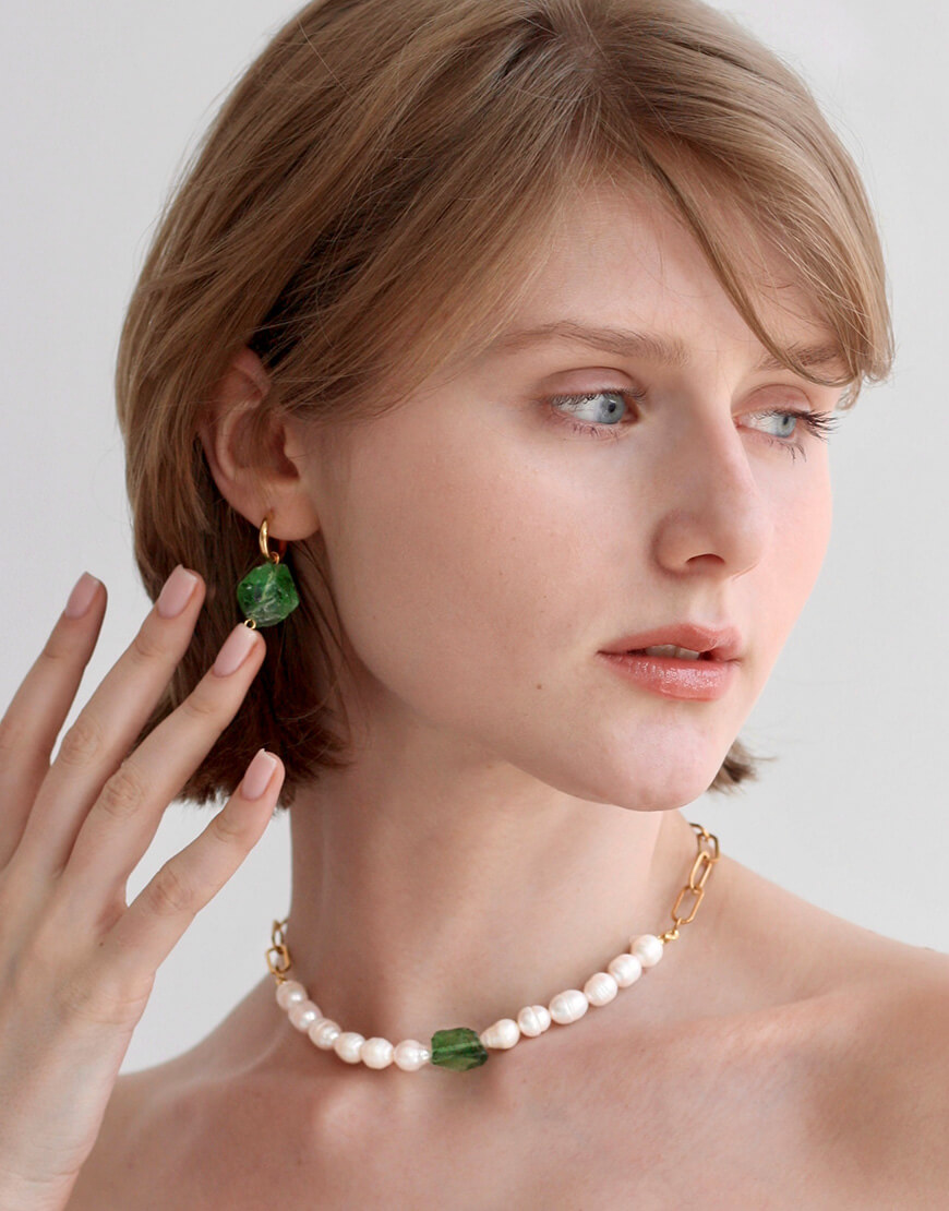 Доставка впродовж 2-5 робочих днівНамисто з натуральних перлин та зеленим аква кварцем посередині, довжина 45 см, вага24г