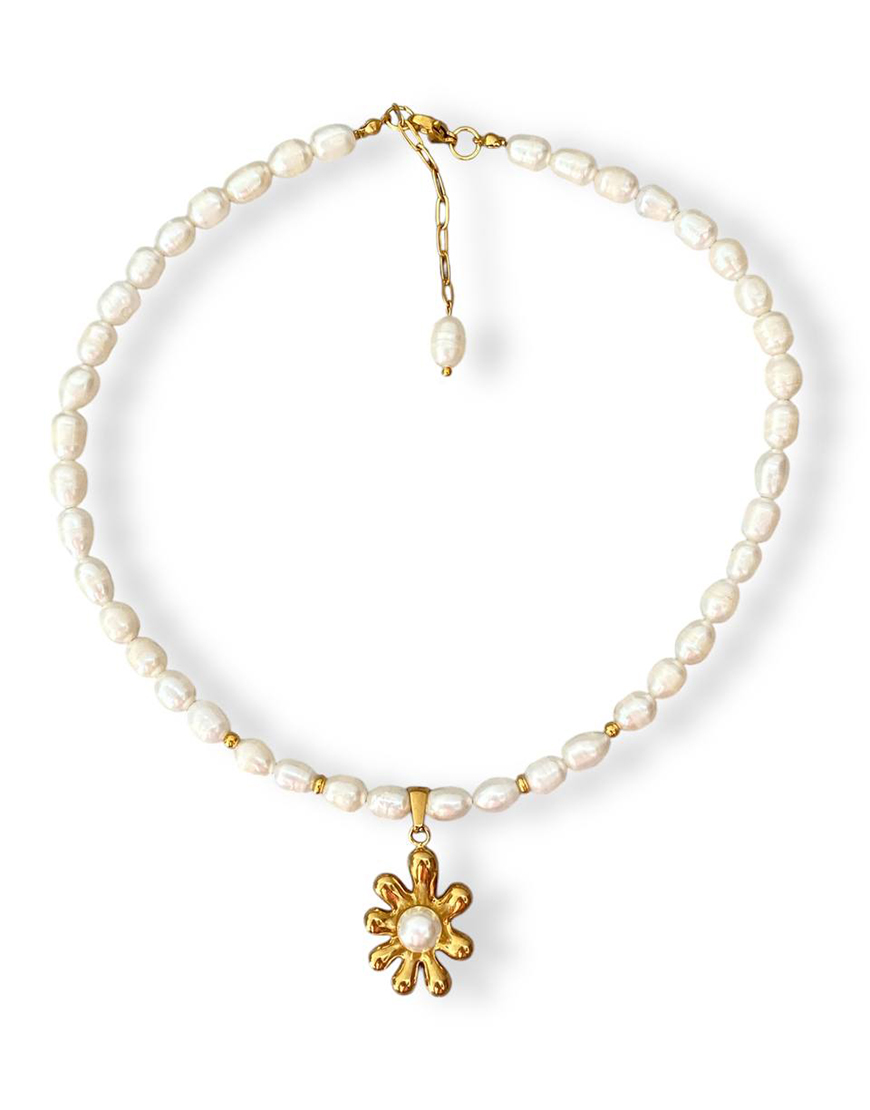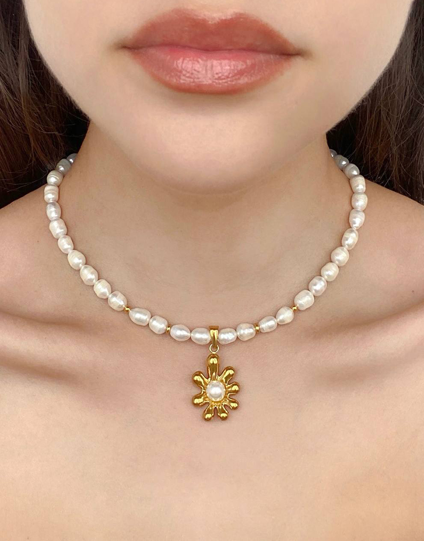 Доставка впродовж 2-5 робочих днівНамисто з натуральних перлин з позолоченою квіткоподібною підвіскою, довжина 37+5см, вага 41г