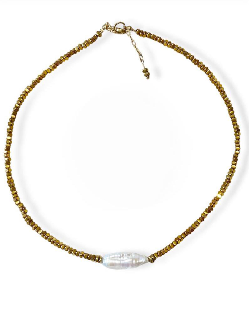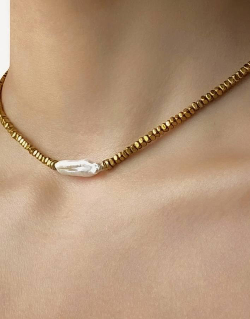 Доставка впродовж 2-5 робочих днівНамисто вагою 14гр, з дрібного гематиту з прямокутною перлиною