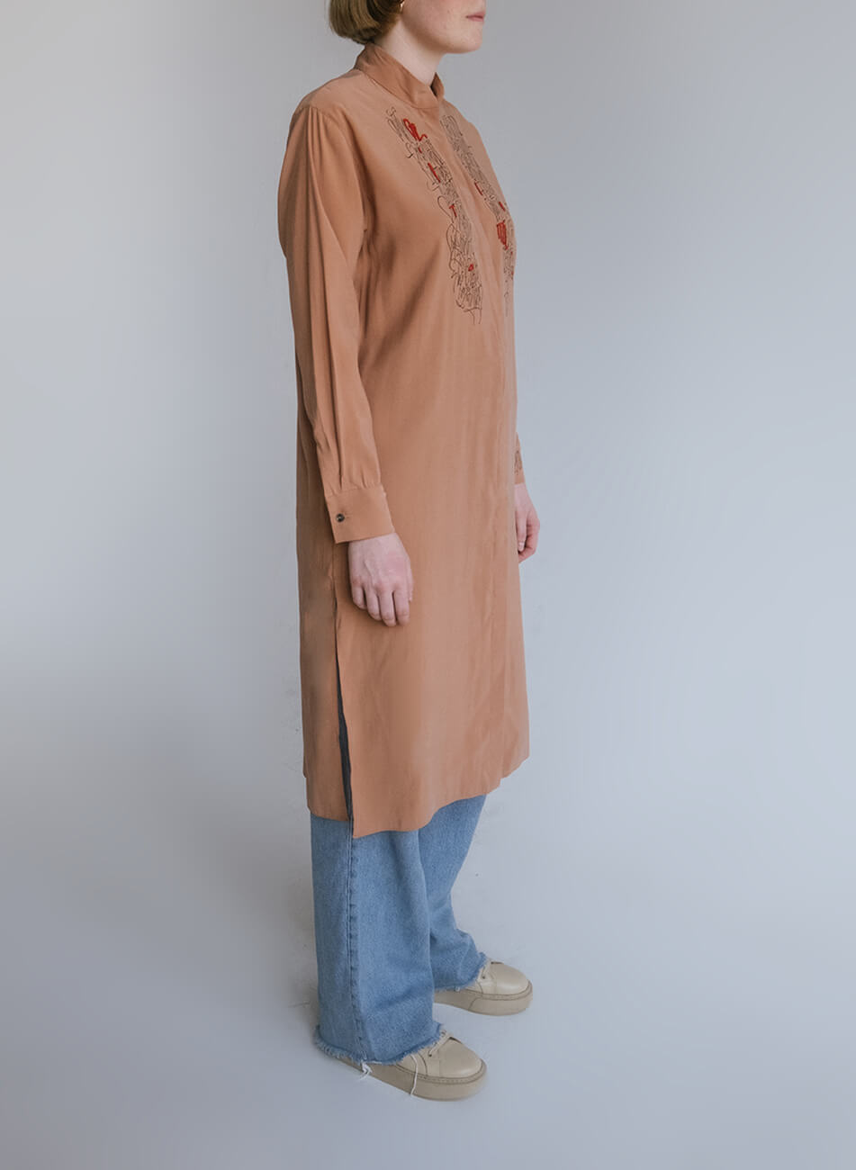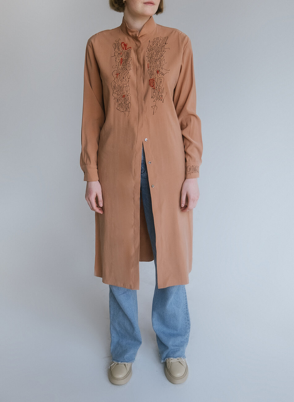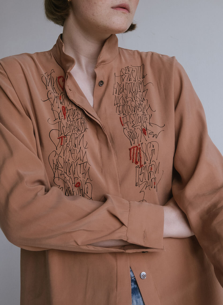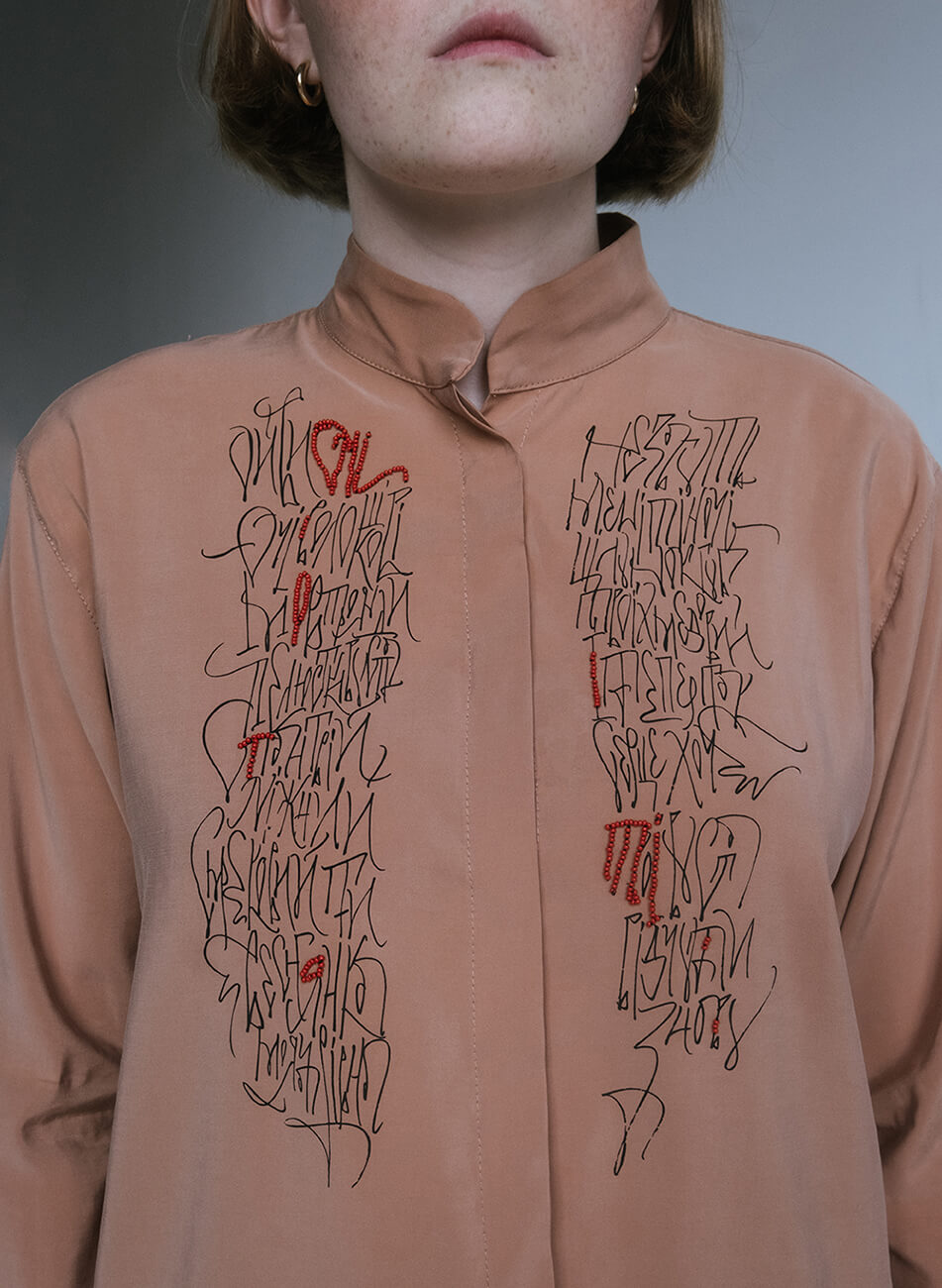 Бежева сорочка з приємного на дотик матеріалу Купра. Словесний орнамент, створений із тексту пісні «Очи василькові», за формою імітує вишивку на традиційних українських вишиванках. Ілюстрація виконана відомою українською каліграфісткою Вікторією Лопухіною. Сорочка вручну вишита бісером Світланою, майстром благодійного фонду “Життєлюб”.