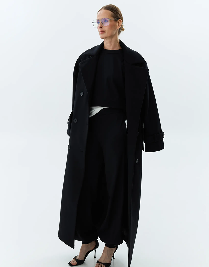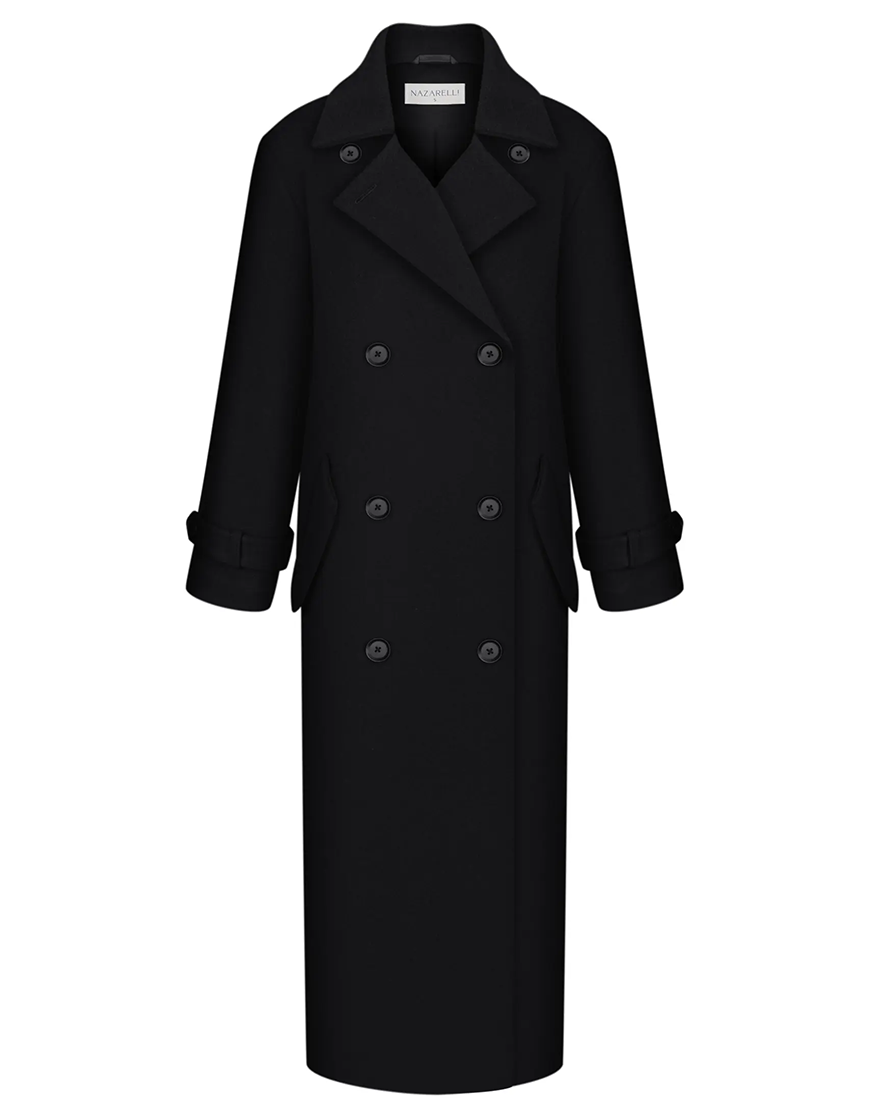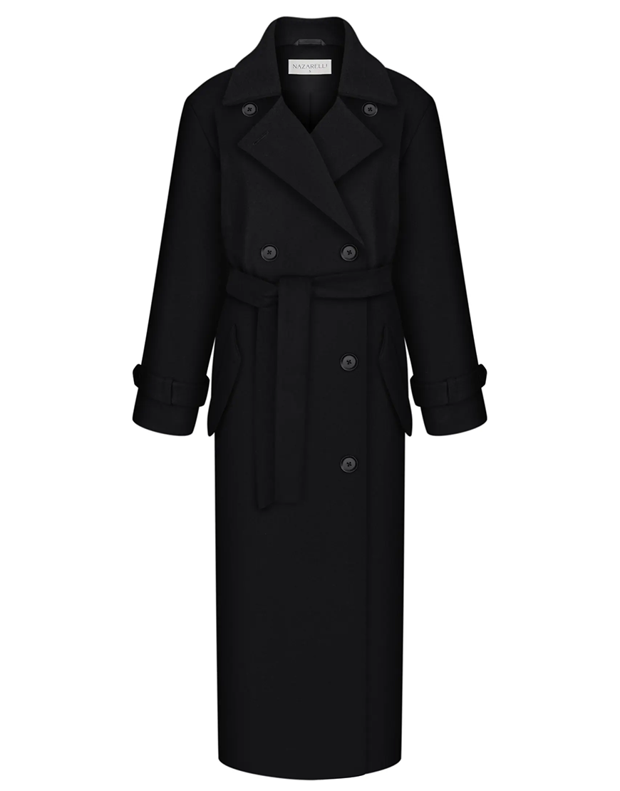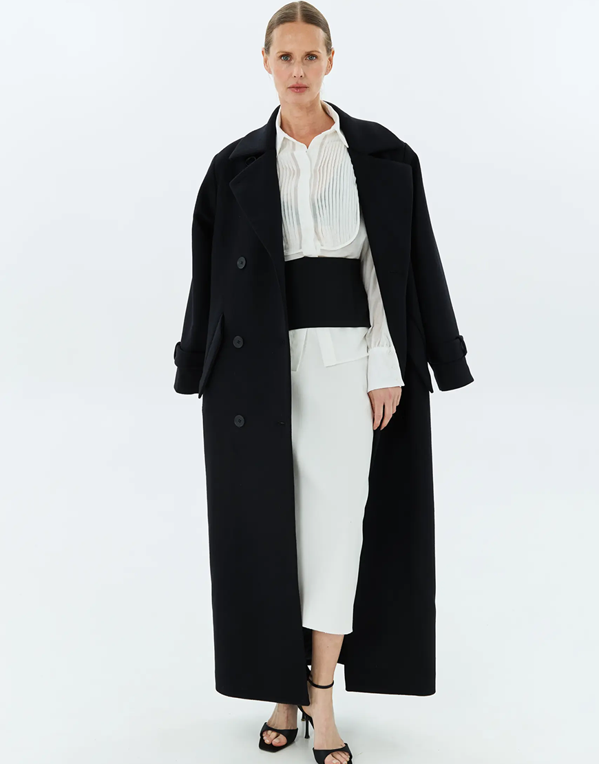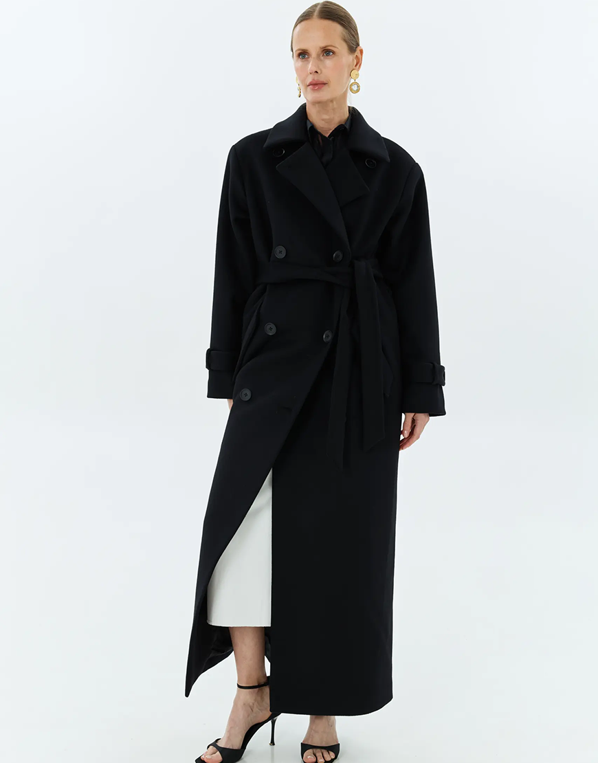 Доставка впродовж 2-14 робочих днівСтильне пальто довжини максі у чорному кольорі. Модель виконана у класичному подовженому крої з двобортною застібкою та поясом, що підкреслює талію. Деталі з відворотними лацканами й манжетами додають образу елегантності. Ідеальний варіант для холодного сезону — легко поєднується з класичними й кежуал-образами.