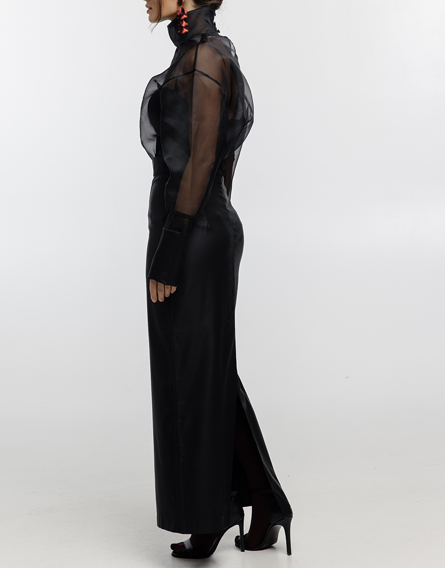 Посередині шлиця, довжина від її початку до низу спідниці – 60 см.