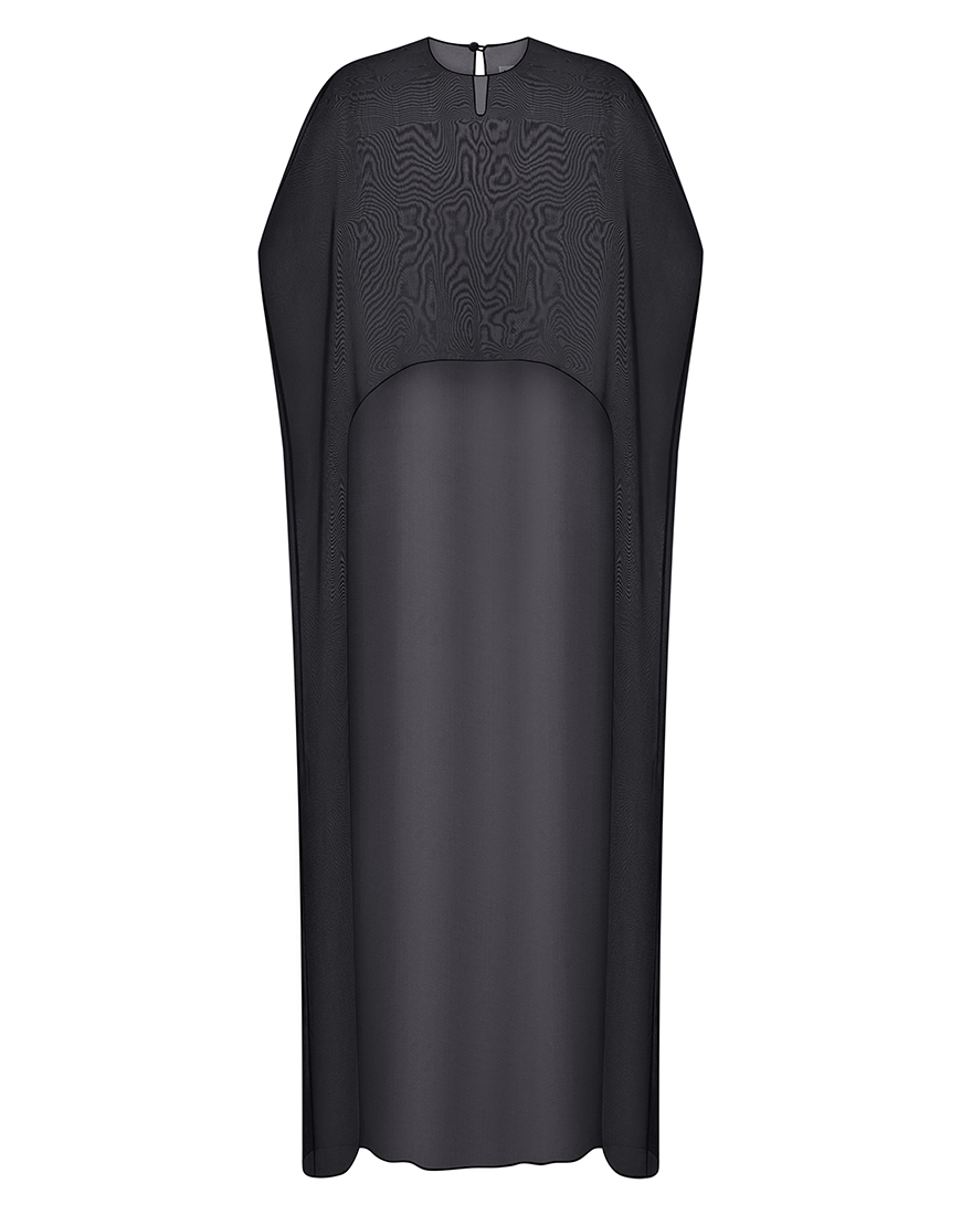 Доставка впродовж 2-14 робочих днівВиконаний із тончайшого шовка — вуаль (100% шовк). Сукня як накидка на плечі в романтичному стилі. Силует — прямий, максі довжина з шлейфом. Полочка викроєна у вигляді «арки». Горловина закрита, кругла, по спинці застібка: навісна петля + ґудзик. Висота арки по поличці — 50 см. Довжина спинки зі шлейфом — 173 см. Рукава доповнені окантовкою органзи шириною 3 см. Довжина підрізана — 77 см. Довжина рукава — 61 см + 3 см органзи. Ширина плеча — 14,5 см.