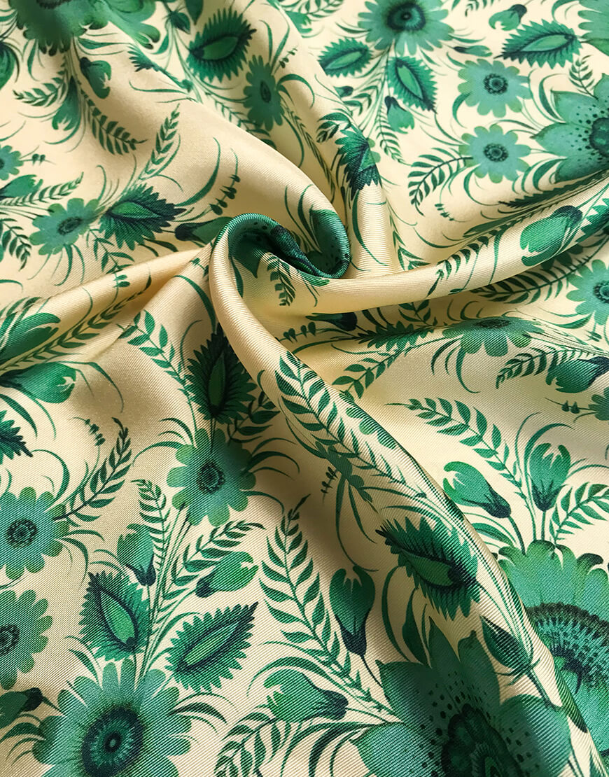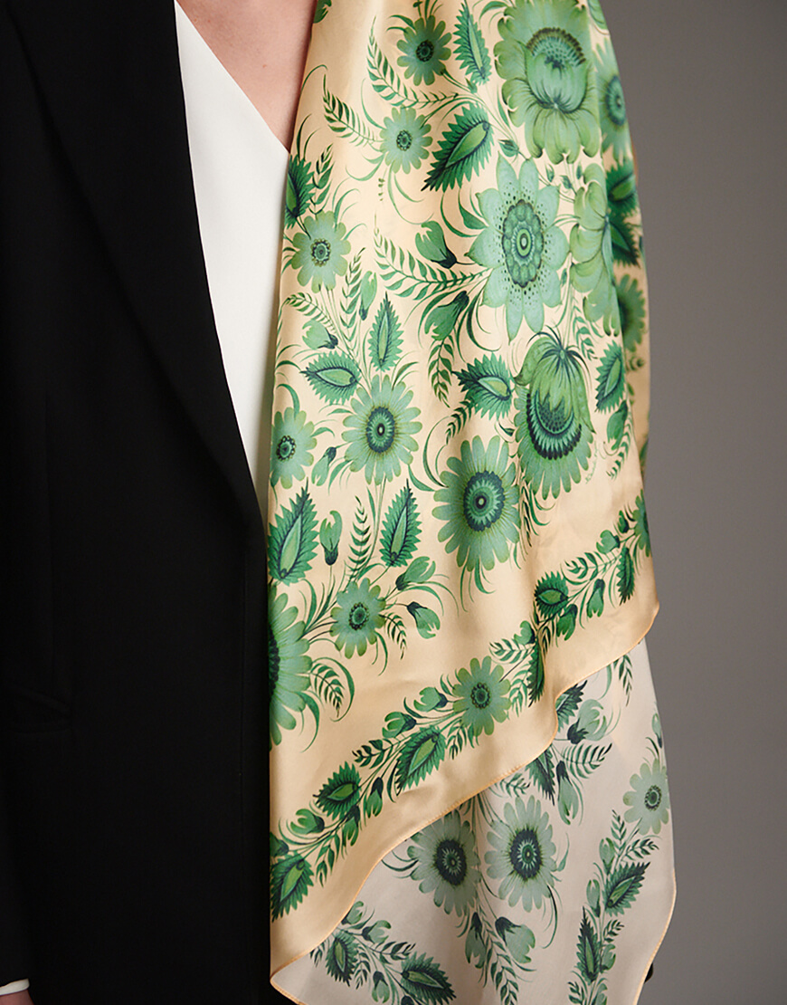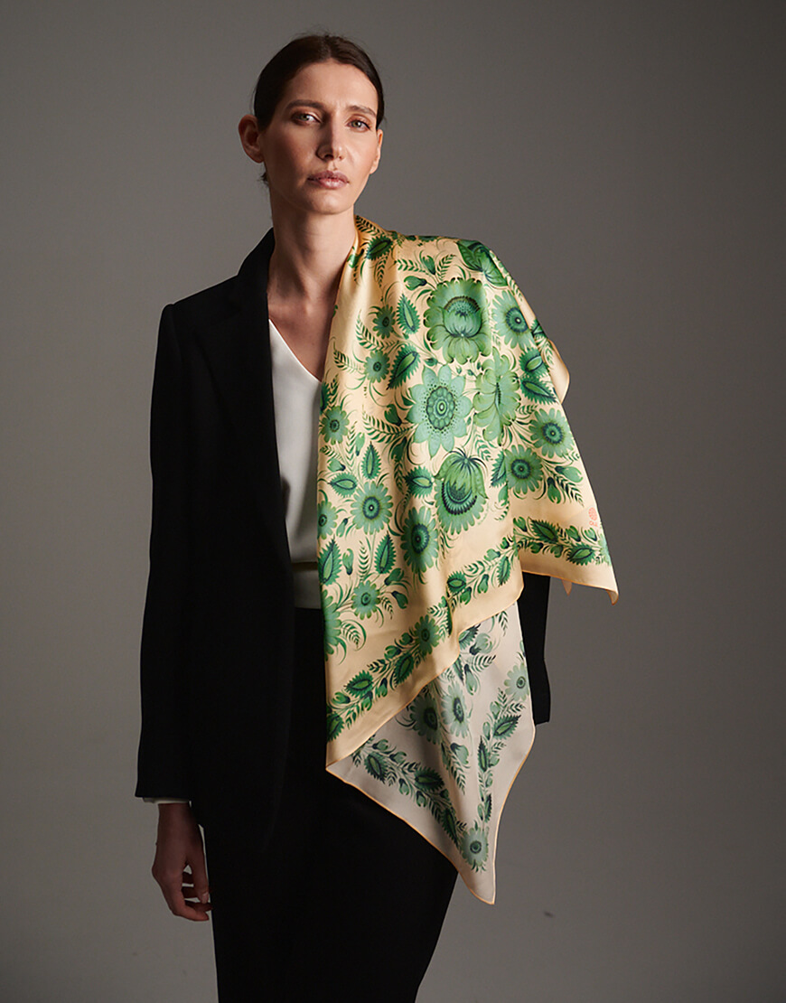 Доставка впродовж 5-7 робочих днівТрадиційна хустина виготовлена із натурального італійського шовку твіл, який дозволяє легко драпірувати аксесуар та допомагає тримати обрану форму.