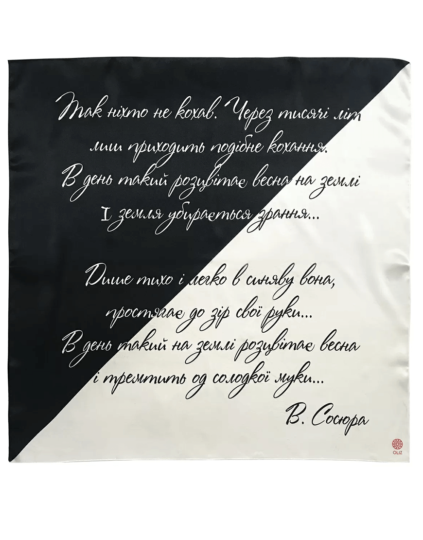 Доставка впродовж 5-7 робочих днівУривок з віршу про неймовірну силу земного кохання «Так ніхто не кохав» Володимира Сосюри ми перенесли на італійський шовк, щоб ви змогли подарувати своїм коханим не просто дорогоцінний аксесуар, а ще розповісти або нагадати про свою любов.