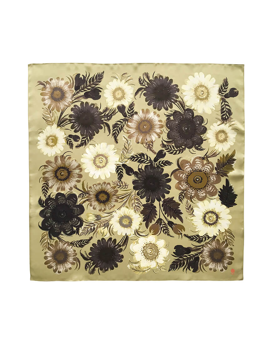 Доставка впродовж 5-7 робочих днівХустина з флористичним орнаментом у петриківському стилі «Camo». Шовкова хустина у кольорах мілітарі з‘явилась у колекції Вільні у перші дні війни та стала символом протистояння та оборони України. Хустина виготовлена з натурального італійського шовку. Базова гамма кольорів, у яких виконана хустина, може підтримати обраний вами образ, не відвертаючи уваги від головних деталей, додасть йому елегантності та завершеності. 50% від прибутку виробу ми передаємо на підтримку ЗСУ.