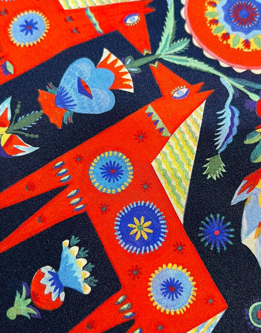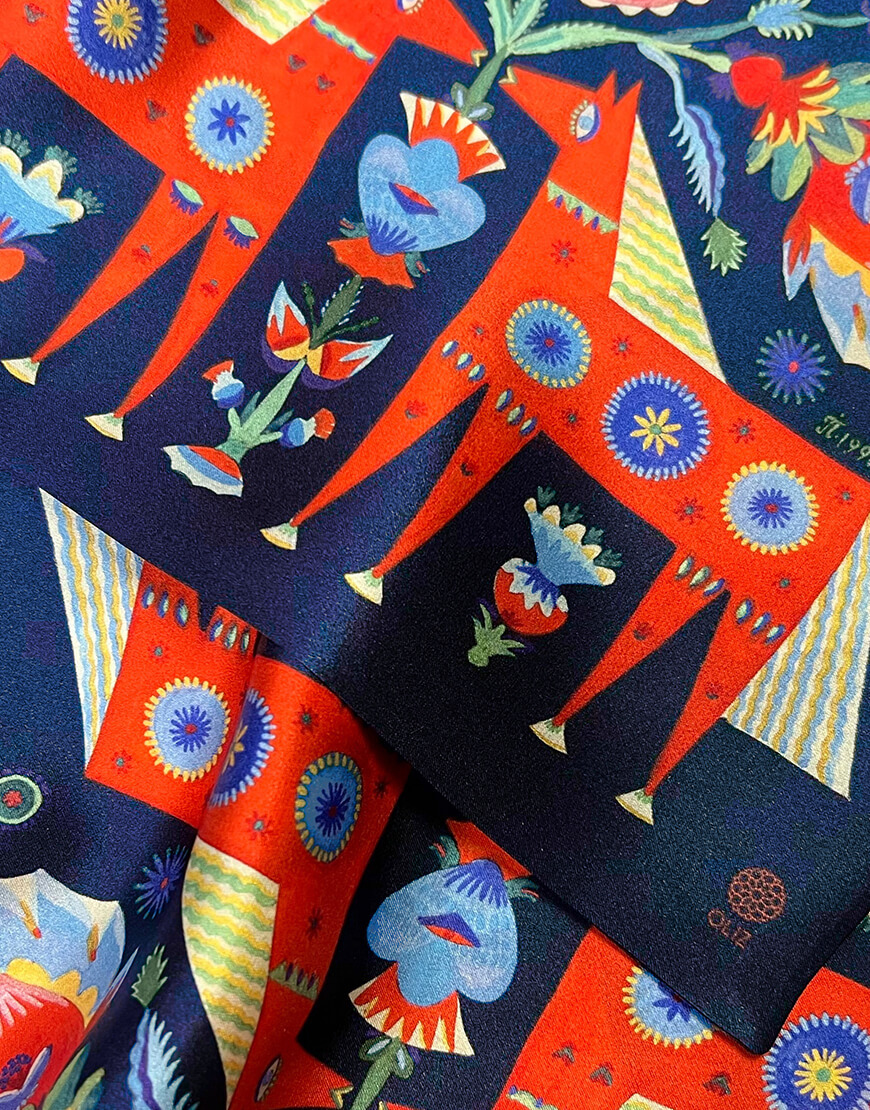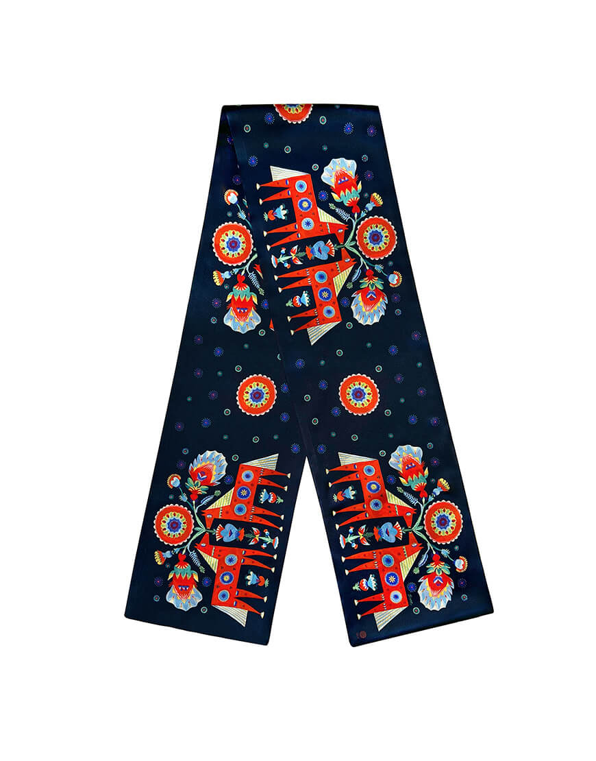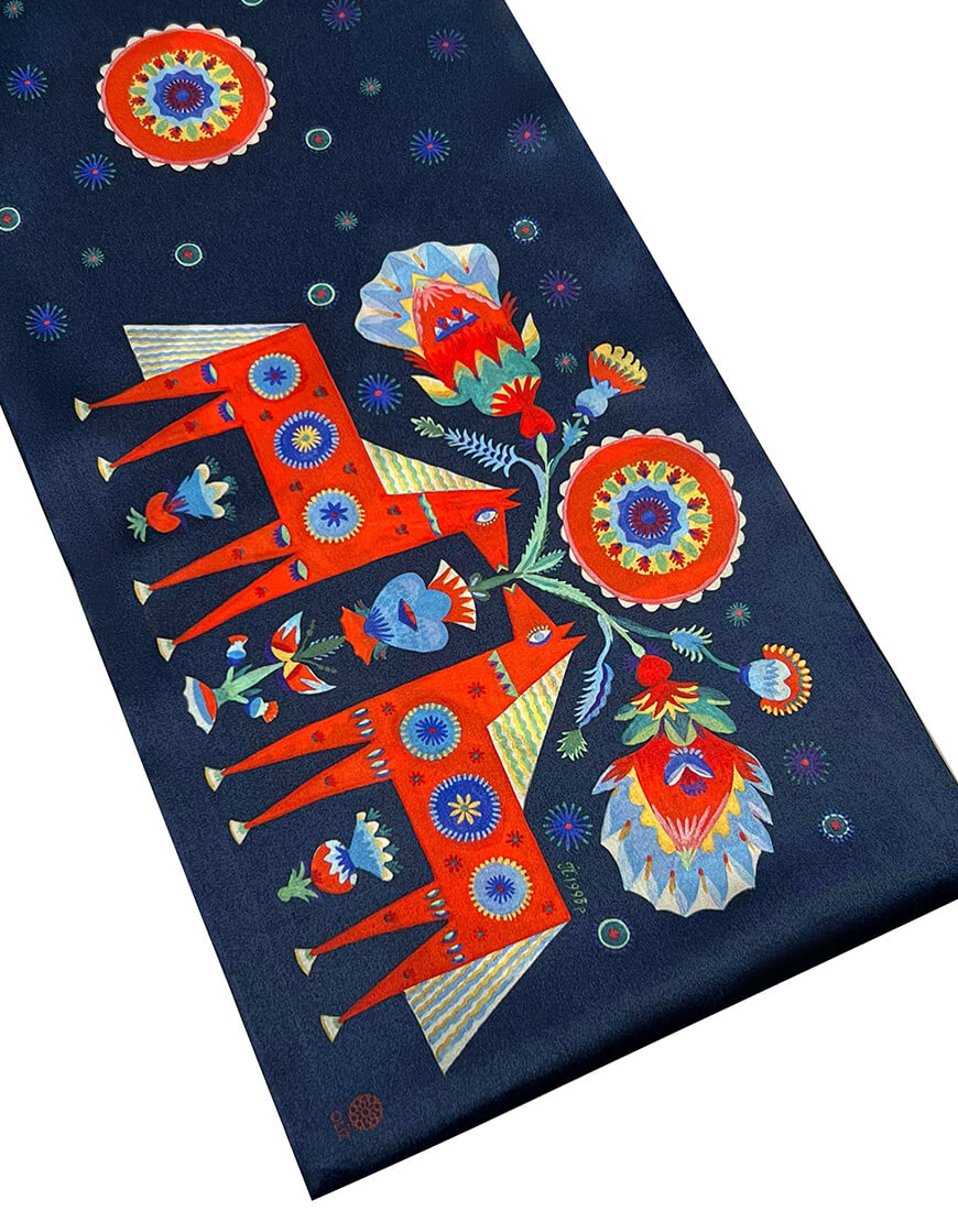 Доставка протягом 5-7 робочих днівШовковий твіллі «Космічна радість» із картиною Івана Приходько у стилі наївного мистецтва. В цій картині художник знову звертається до сакрального символу звʼязку світів, неба та землі, родинного щастя та єдності – дерева життя, а образом кохання, вірності та відданості слугує пара закоханих уквітчаних коней. Неймовірно потужну енергію життя та любові випромінює цей малюнок.