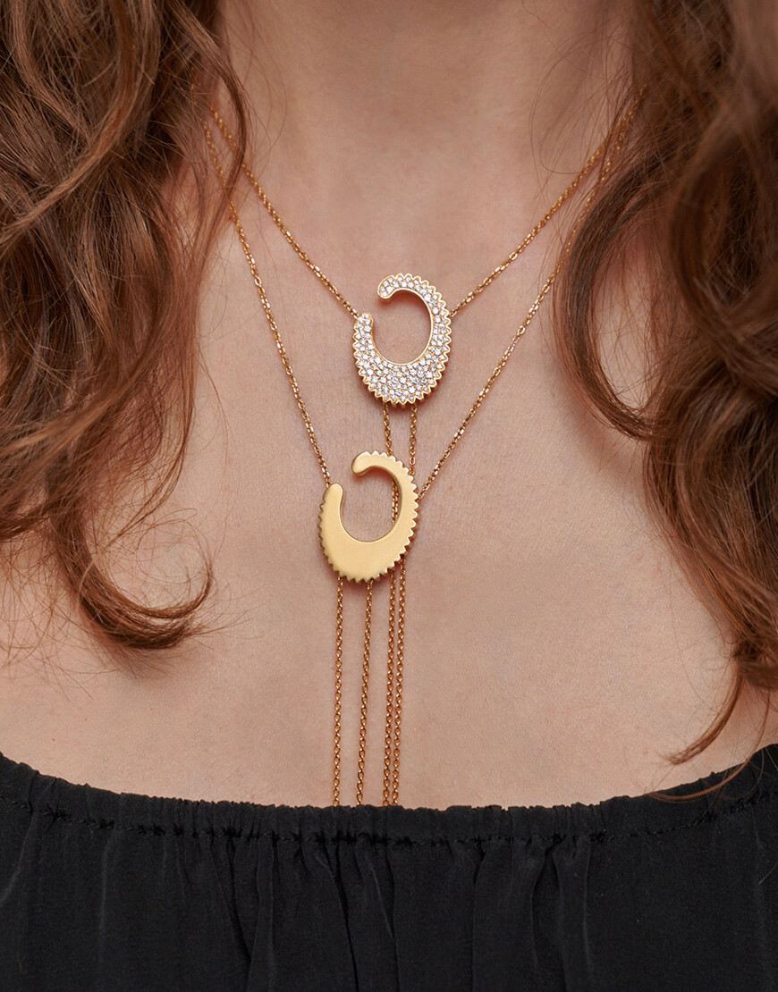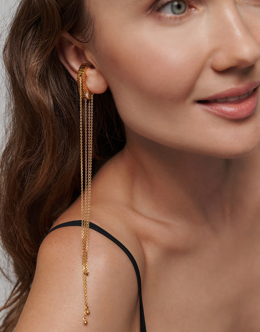 *Щоб легко та швидко вдягнути кафф на вухо, слід вдіти його через найтоншу ділянку хряща та опустити вниз по вушній раковині до бажаної точки. Аби допасувати форму та довжину кольє на шиї, слід потягнути за один із ланцюжків у бажаному напрямку.
