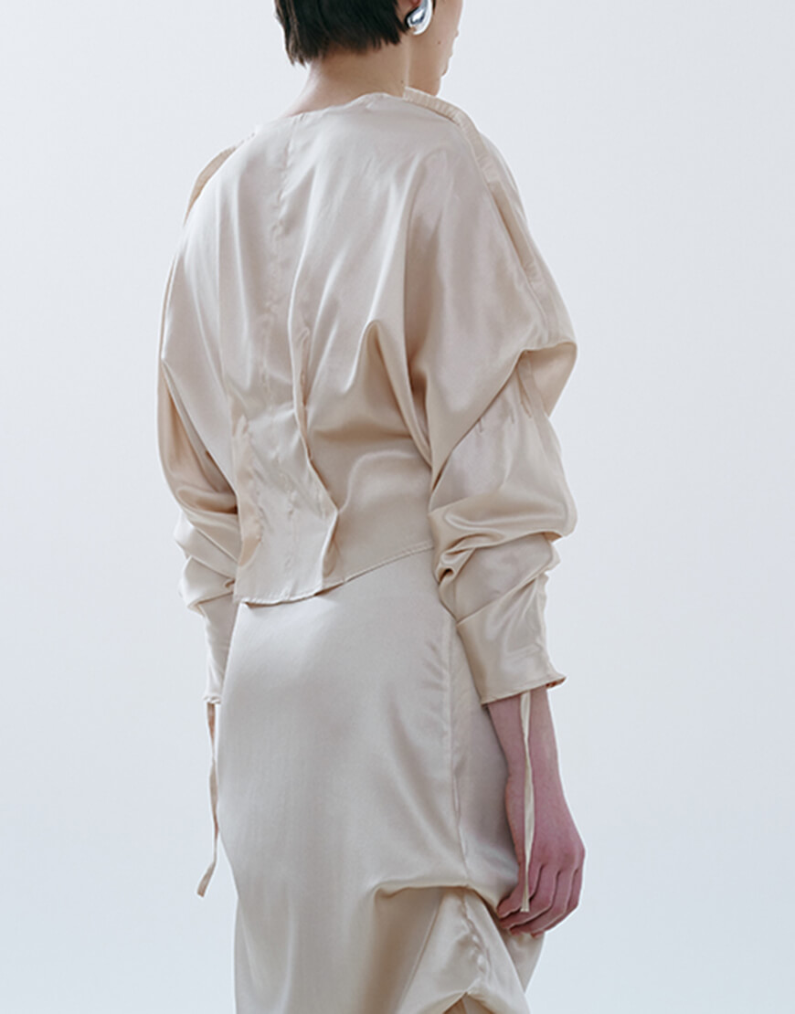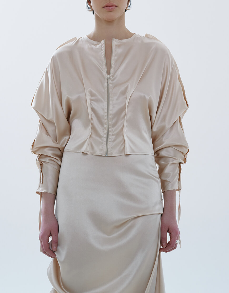 Доставка протягом 5-7 робочих днівШовкова блуза з блискавкою та драпіруванням на рукавах, виконана з 100% натурального італійського шовку.