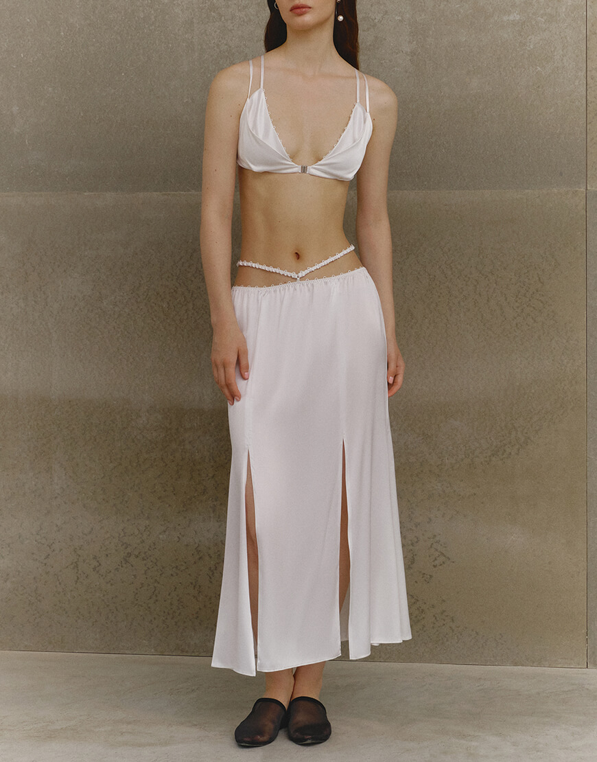 Доставка протягом 5-7 робочих днівБіла шовкова спідниця з розрізами та бретелями на низькій посадці та топ на подвійних бретелях.
