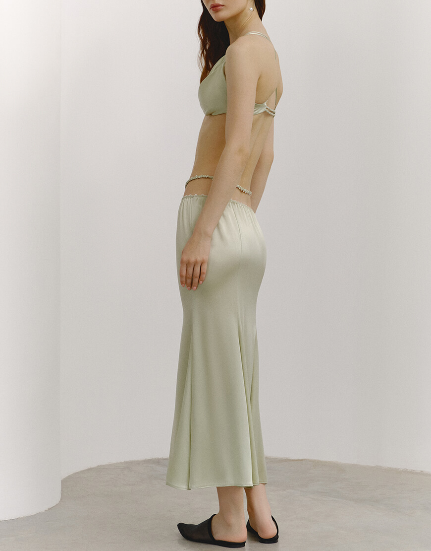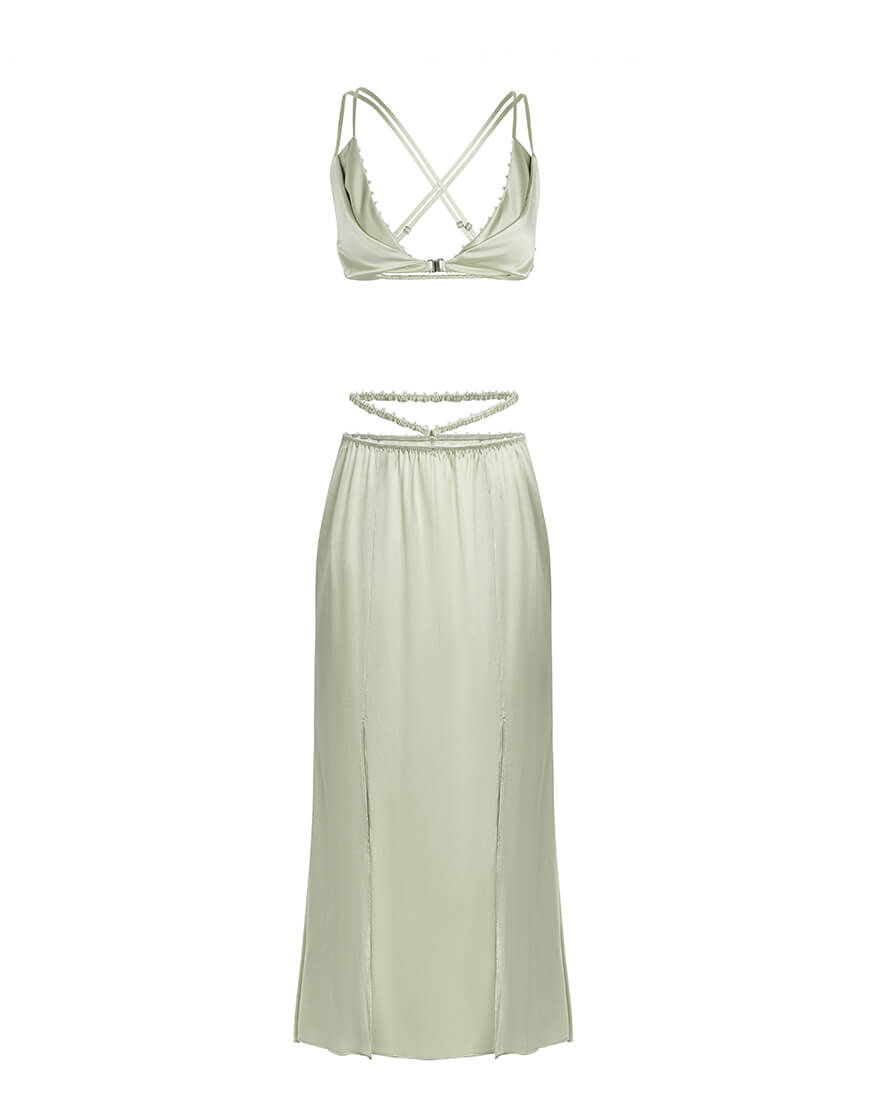Доставка протягом 5-7 робочих днівОливкова шовкова спідниця з розрізами та бретелями на низькій посадці та топ на подвійних бретелях.