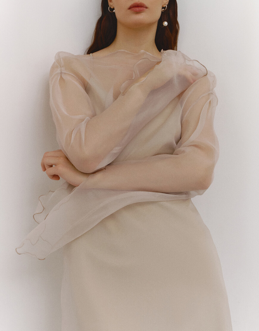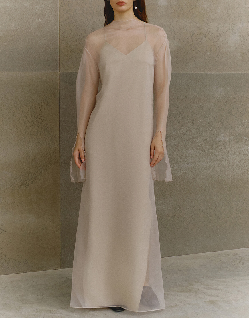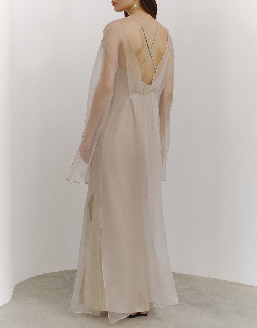 Доставка протягом 5-7 робочих днівПодвійна сукня з верхнім шаром органзи з довгим рукавом та з відкритою спинкою.