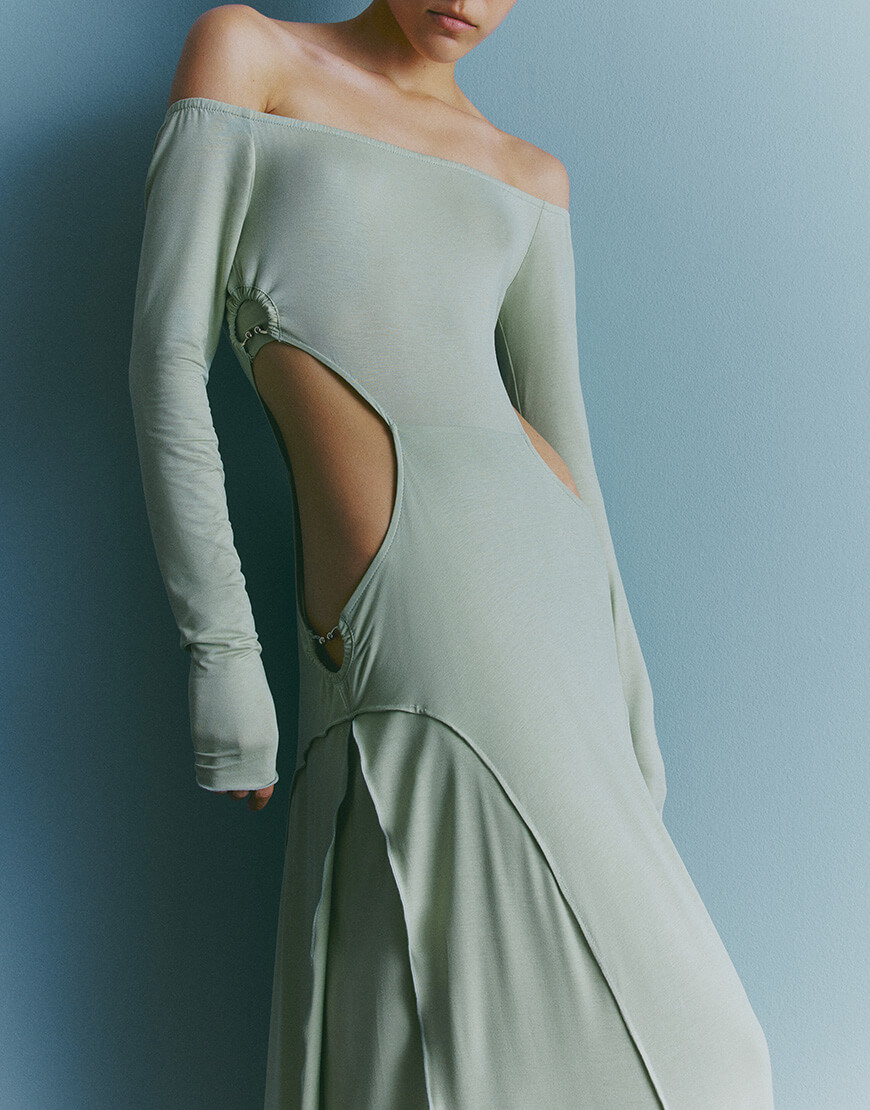 Доставка протягом 5-7 робочих днівТрикотажна оливкова сукня з розрізами на талії