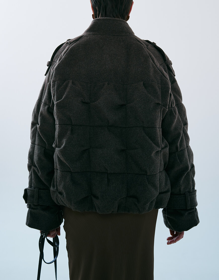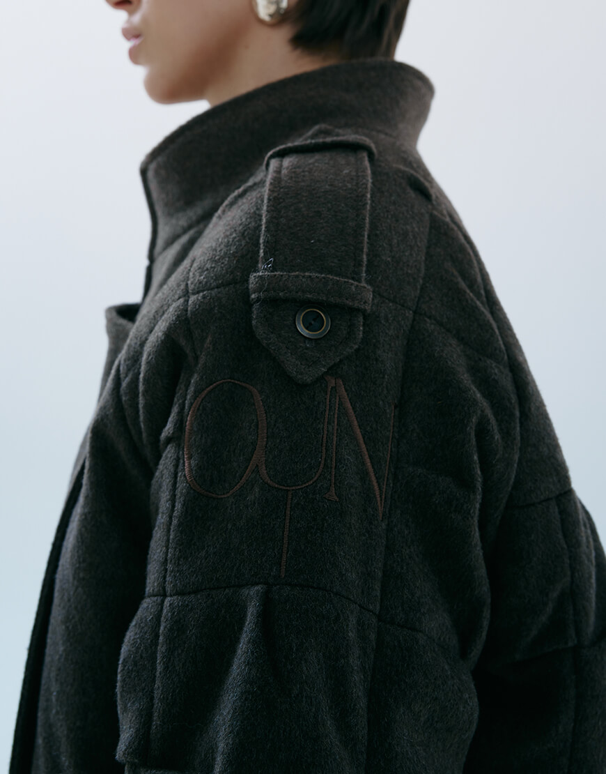 Доставка протягом 5-7 робочих днівКоричневий бомбер з 100% вовни, акцентований фактурними квадратами та вишивкою. Має всередині тепле наповнення та підходить до низьких температур.