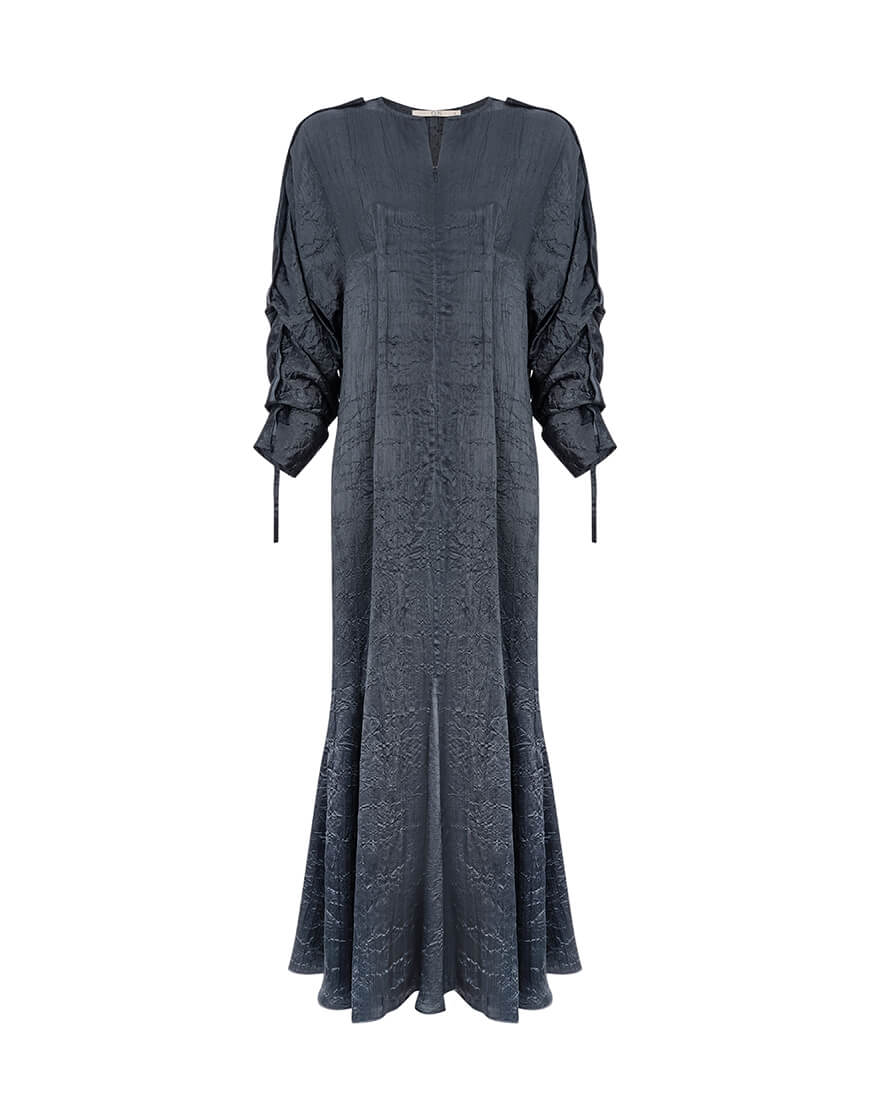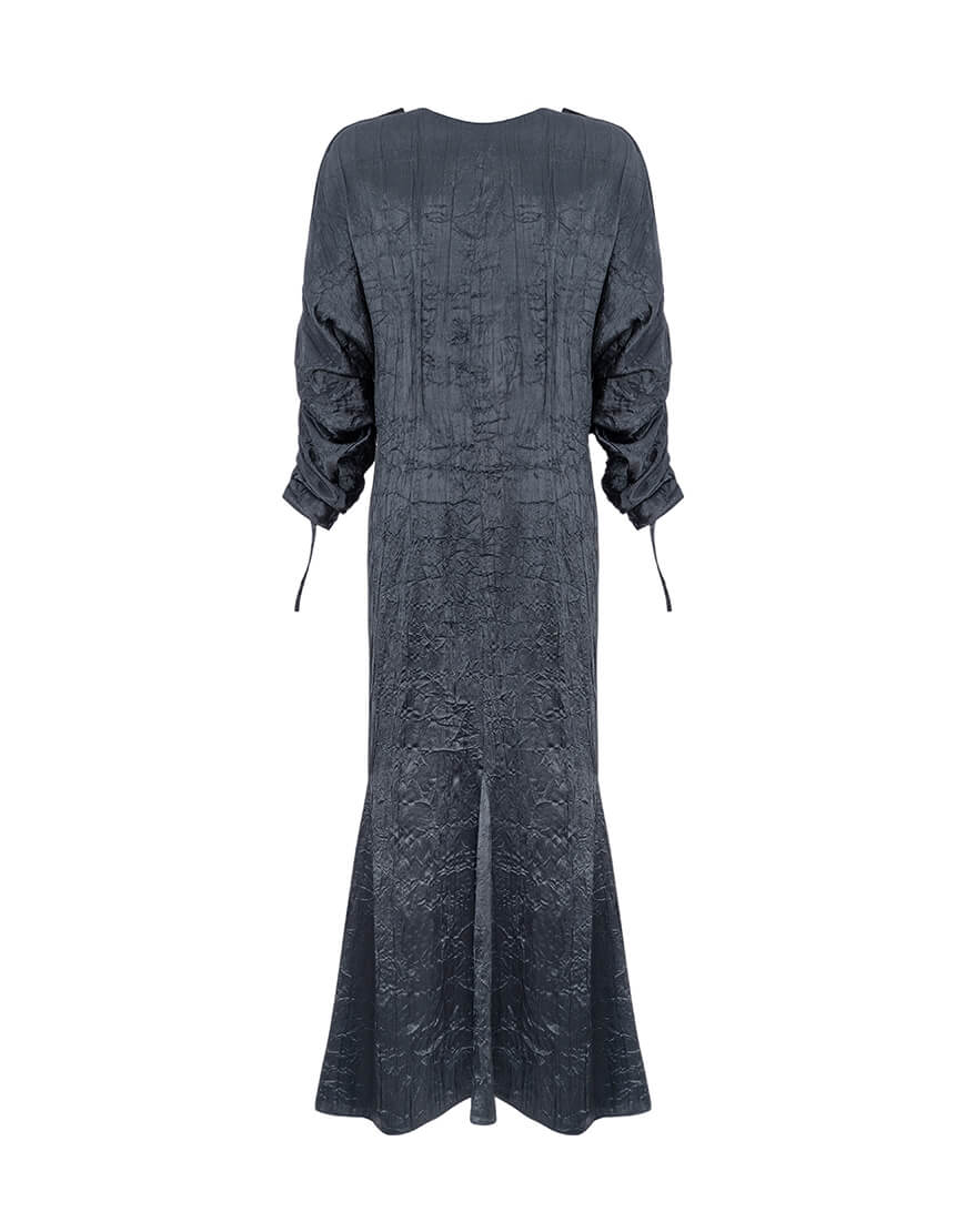 Доставка протягом 5-7 робочих днівСукня максі виконана з синього жатого шовку та силуетними защіпами попереду і акцентною блискавкою.