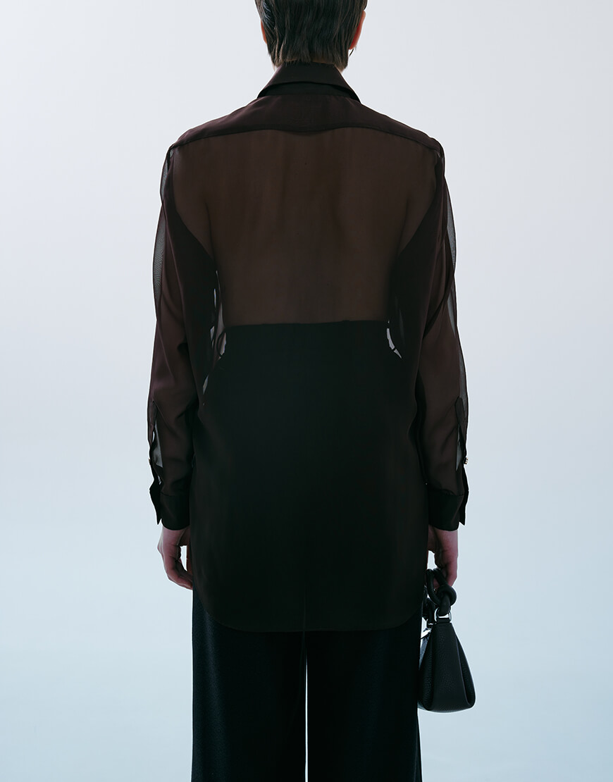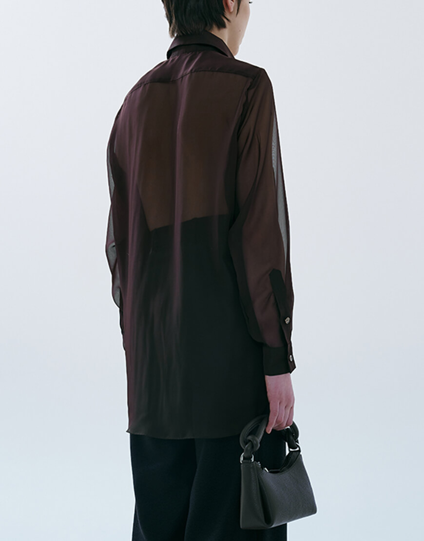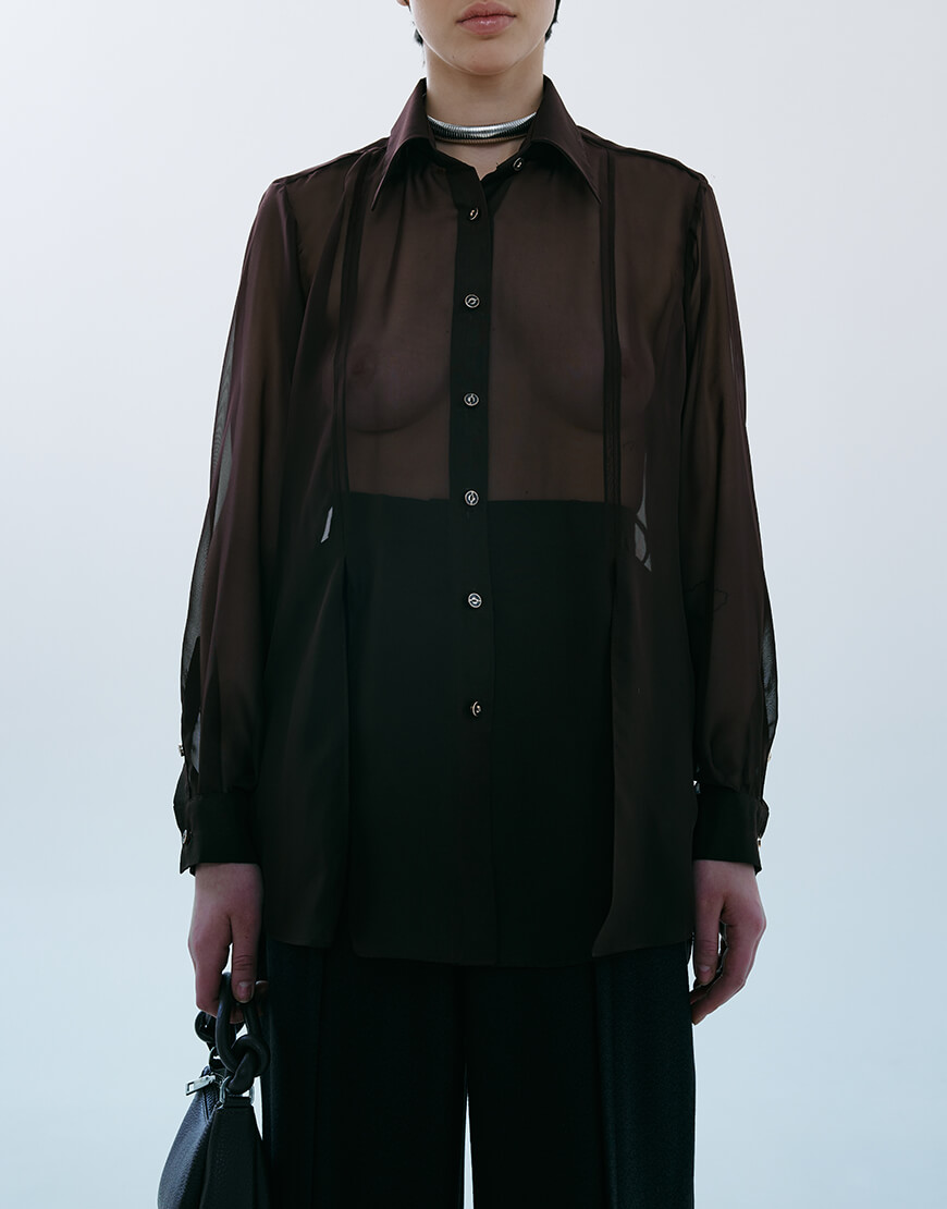 Доставка протягом 5-7 робочих днівТемно-коричнева блуза з шифону акцентована розрізами для зручності створення різних образів.
