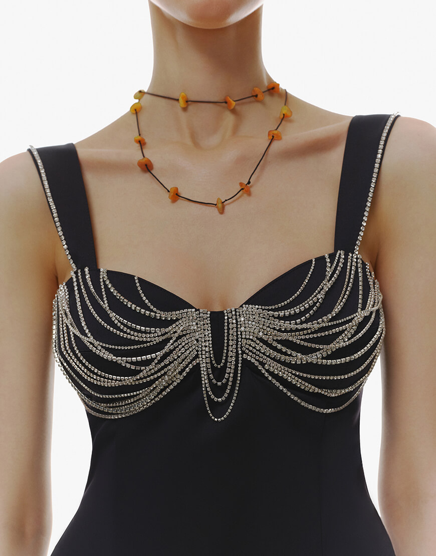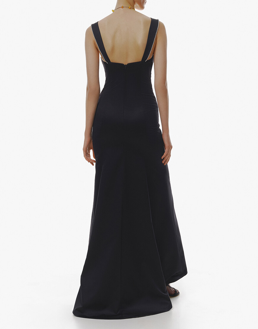 Доставка протягом 5-7 робочих днівЧорна вечірня довга сукня на бретелях та з вишитим камінням на грудях.