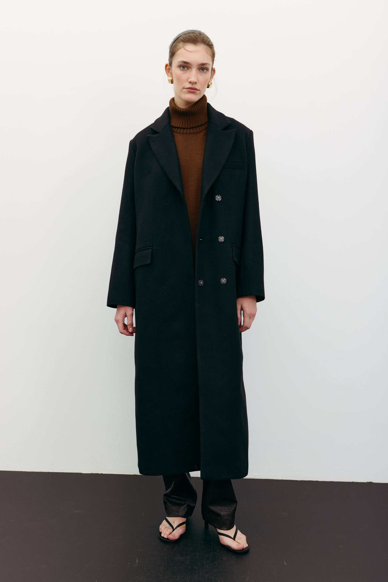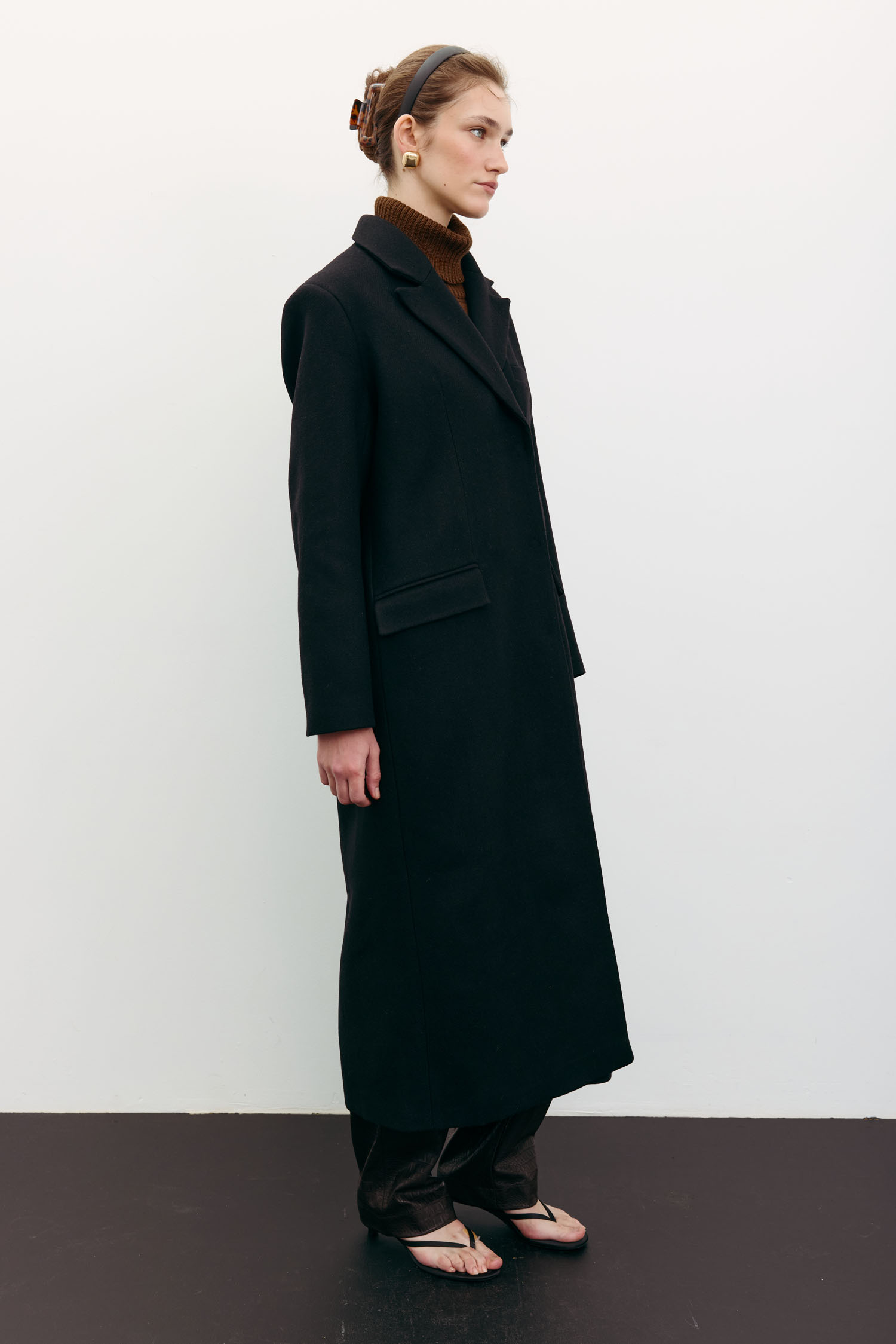 Чорне жіноче пальто пошите з цупкої тканини з високим вмістом натуральної вовни. Має прямий крій, застібається на кнопки й оснащене практичними кишенями. Матеріал добре утримує тепло, тому пальто підходить для осінньо‑зимового сезону.