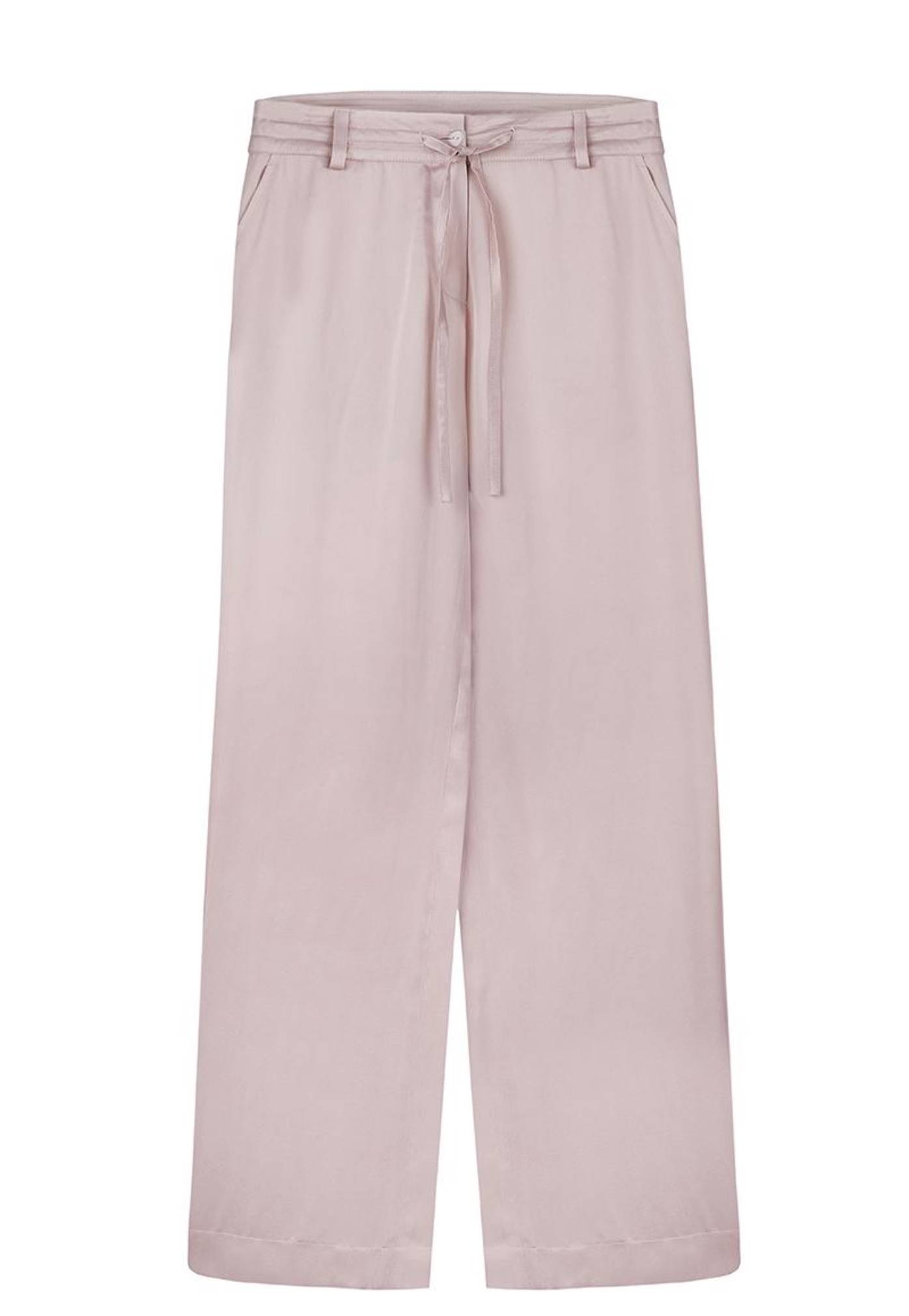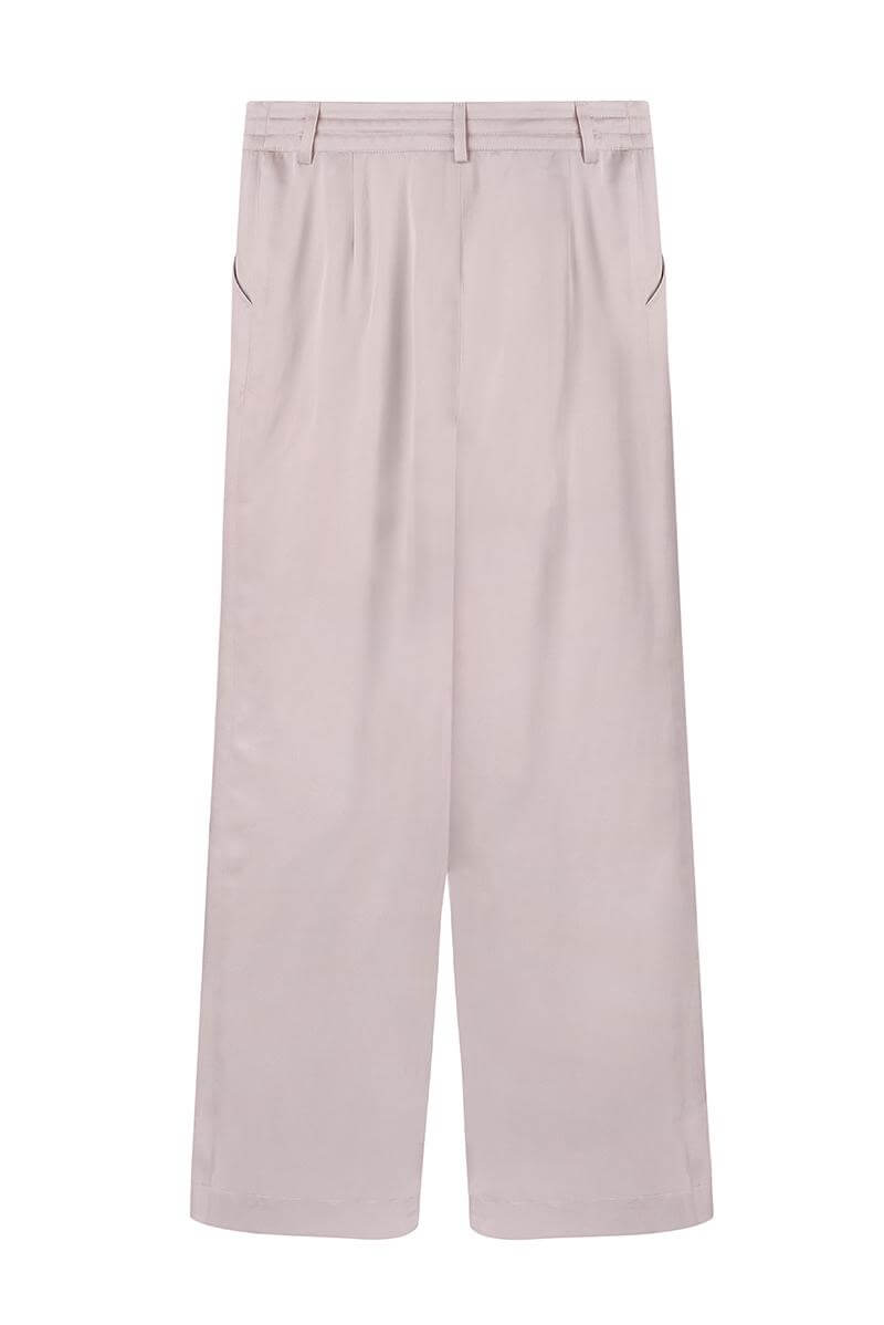 Брюки кольору рожевої пудри, з шовковистого сатину. Тканина холодна на дотик і добре спадає по тілу. Середня посадка, на поясі функціональна куліса, застібка на блискавку та ґудзик. Кишені.