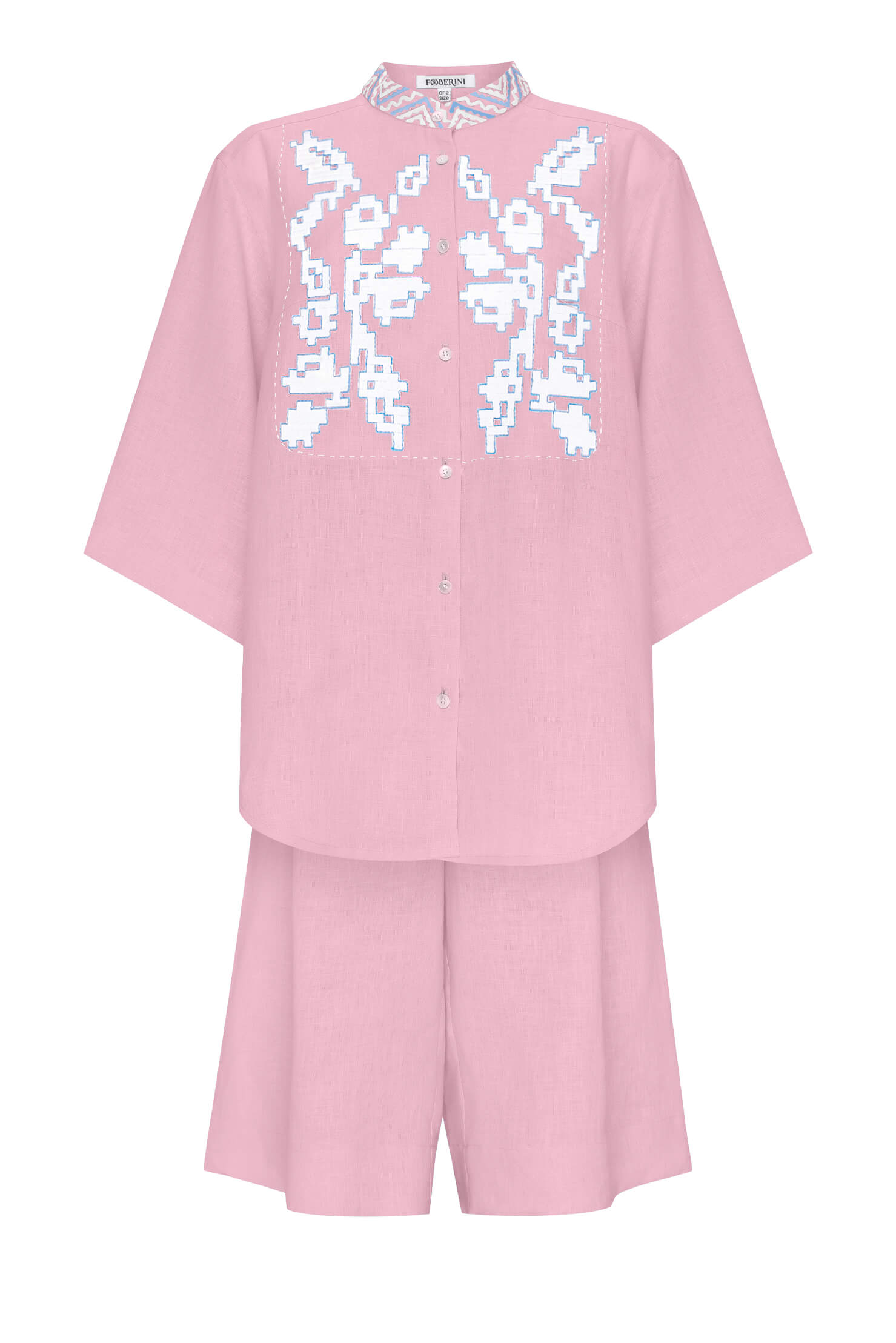 Літній костюм із вишивкою із льону. Складається з сорочки вільного крою та подовжених шортів на зручній резинці із защепами. Комір-стійка та передня частина сорочки прикрашені автентичною вишивкою з ручними стібками. Цей комплект підійде для відпочинку та прогулянок містом.