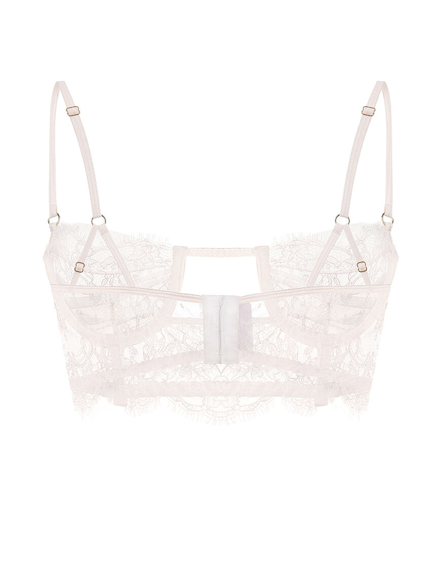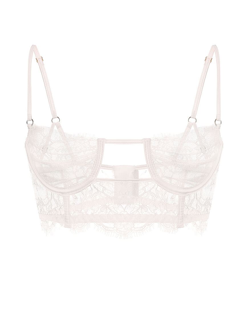 Доставка протягом 2-5 днівБюстьє виконаний із французького мережива, шовку та сітки кольору айворі. М’які тунелі для кісточок і м’які кісточки разом з шовковими регульованими бретельками забезпечують відмінну посадку і комфорт.