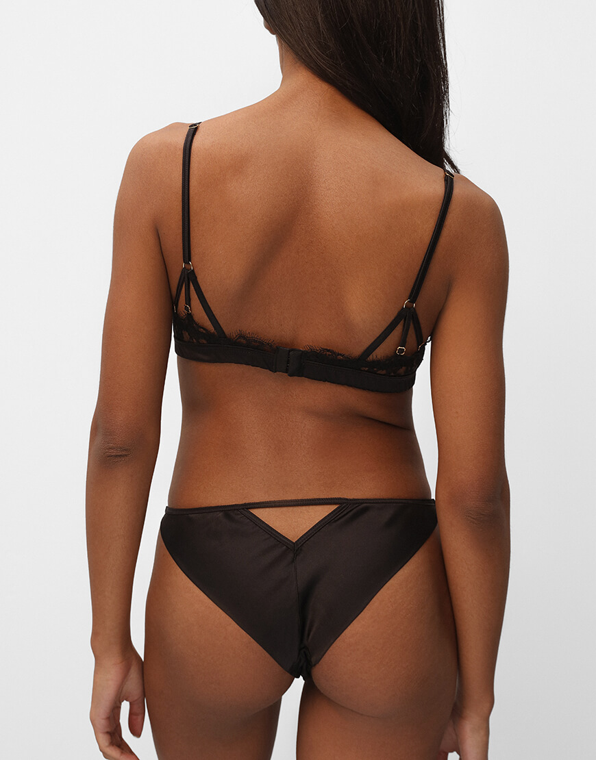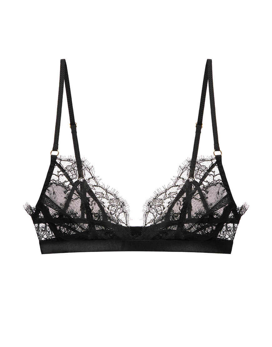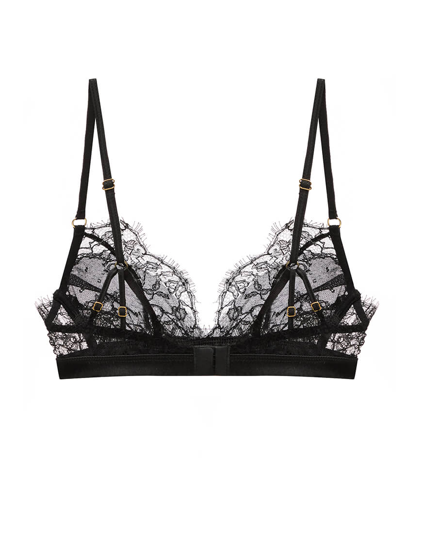 Трикутники декоровані мереживом і тонкою сіткою. Ніжні шовкові бретельки і відсутність кісточок, лише ультра-комфортна еластична основа, покрита шовком, забезпечують чудову підтримку і відчуття. Бюстгальтер прикрашений потрійними деталями шлейки на спині.