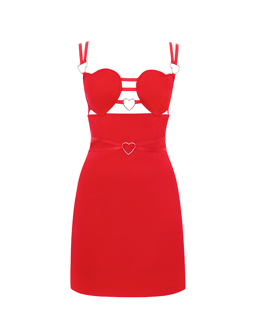 Сукня Любов створена для яскравих виходів і моментів, коли образ має бути безкомпромісно ефектним. Архітектурний ліф із фігурними чашками та декоративними металевими акцентами підкреслює лінію декольте, а приталений крій формує чіткий, жіночний силует.