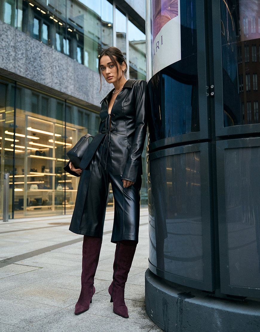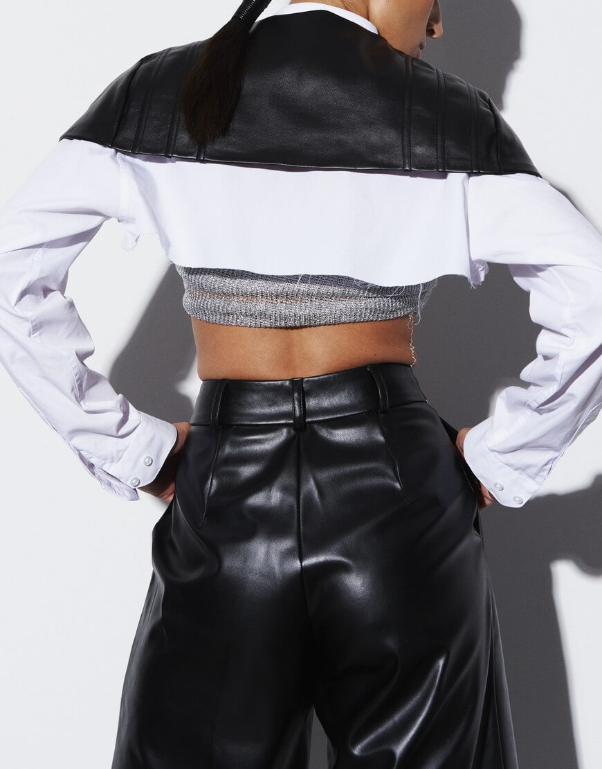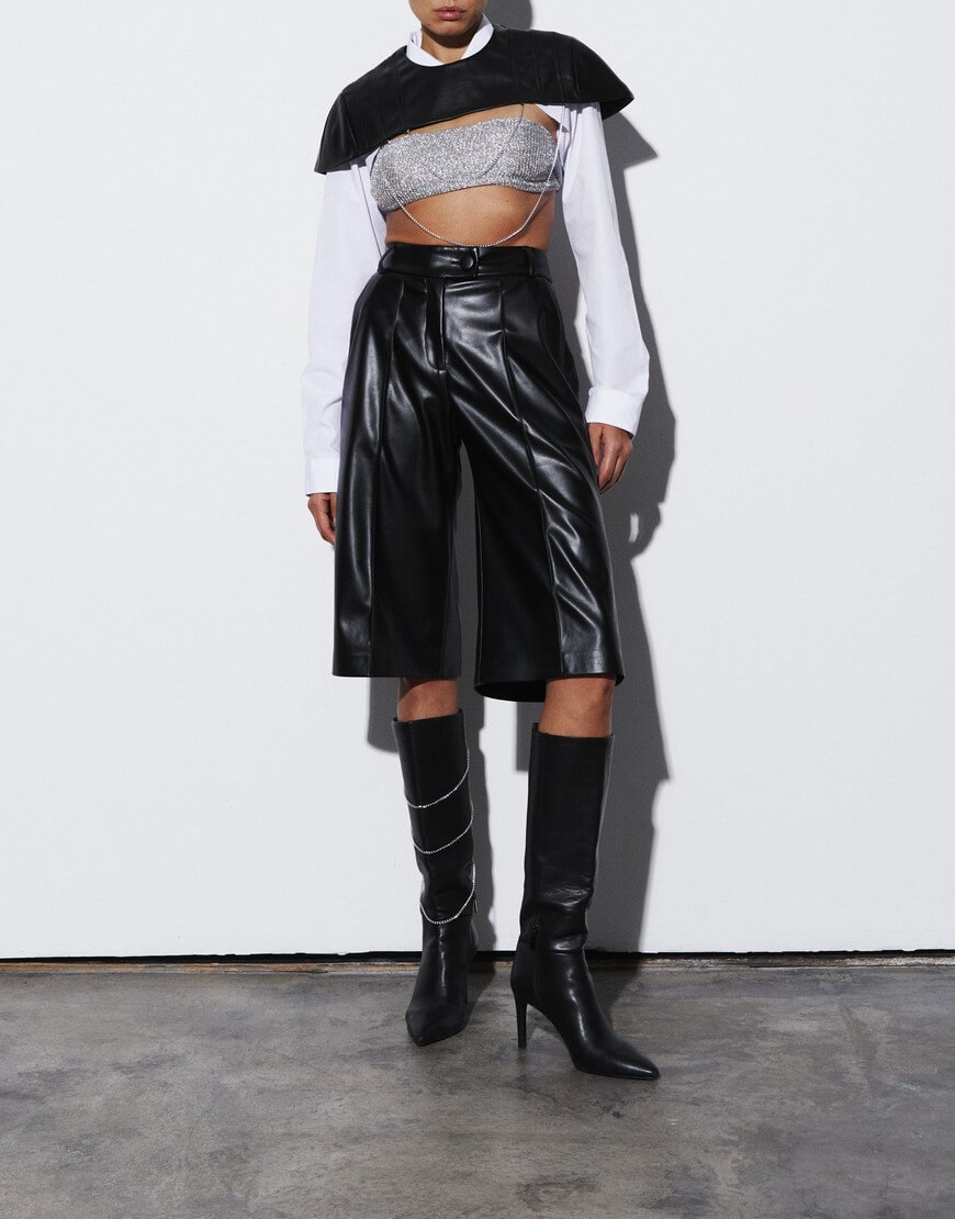 Бермуди чорні, виготовлені з екошкіри. Мають розширений крій донизу. Присутні шлівки для ремня та врізні кишені з боків. Дизайн доповнений класичними стрілками.Бермуди складають комплект із піджаком ,блузою або ж шкіряною накидкоюу тон із поточної колекції бренду.Довжина виробу 68 см, довжина штанини по внутрішньому шву 40 см.